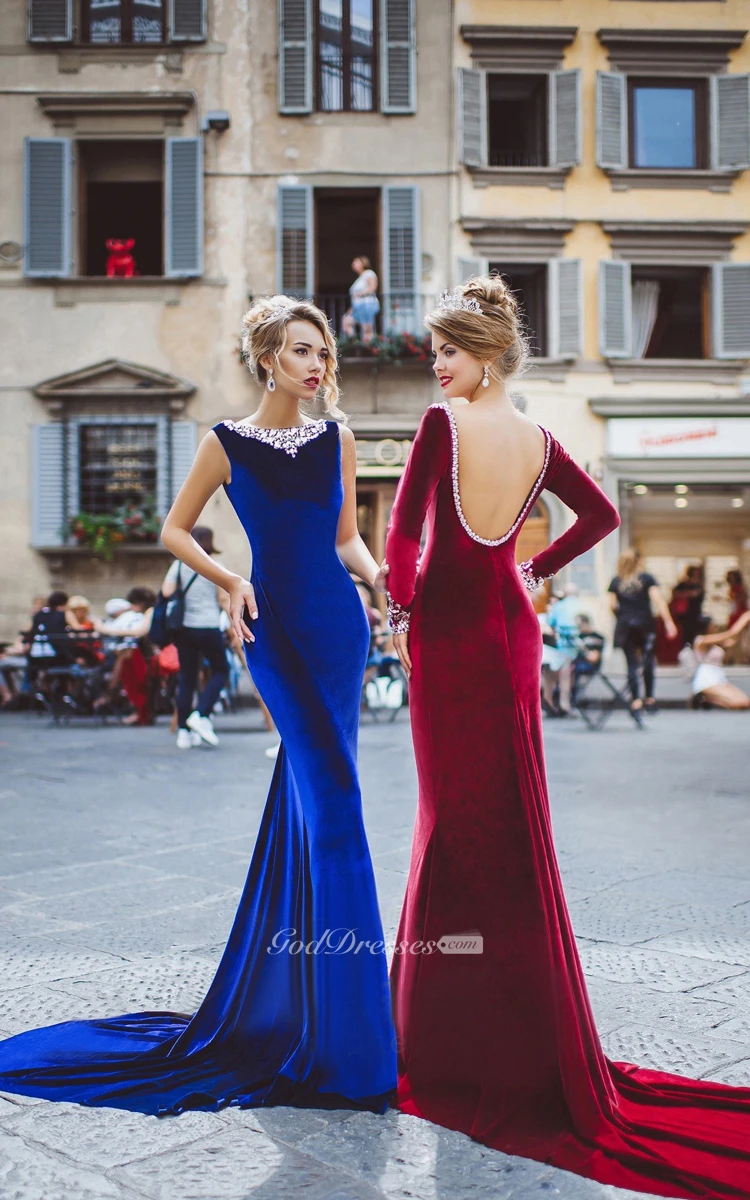 Sheath Court Train High-Neck Long Sleeve Velet Beading Pleats Backless Dress