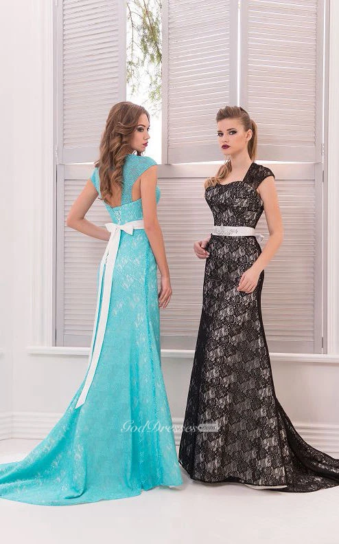 Sheath Court Train Queen Anne Short Sleeve Lace Beading Sash Backless Dress