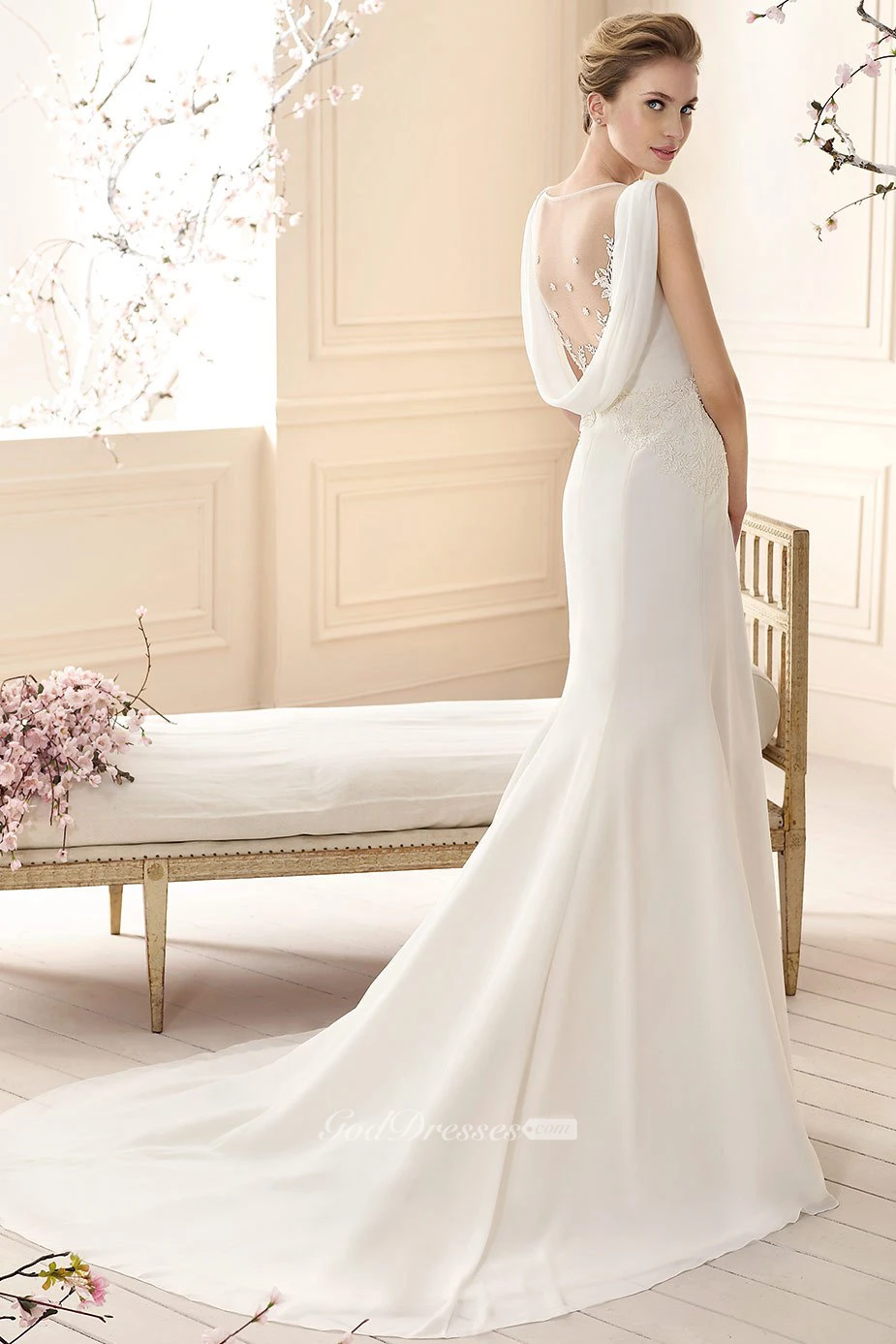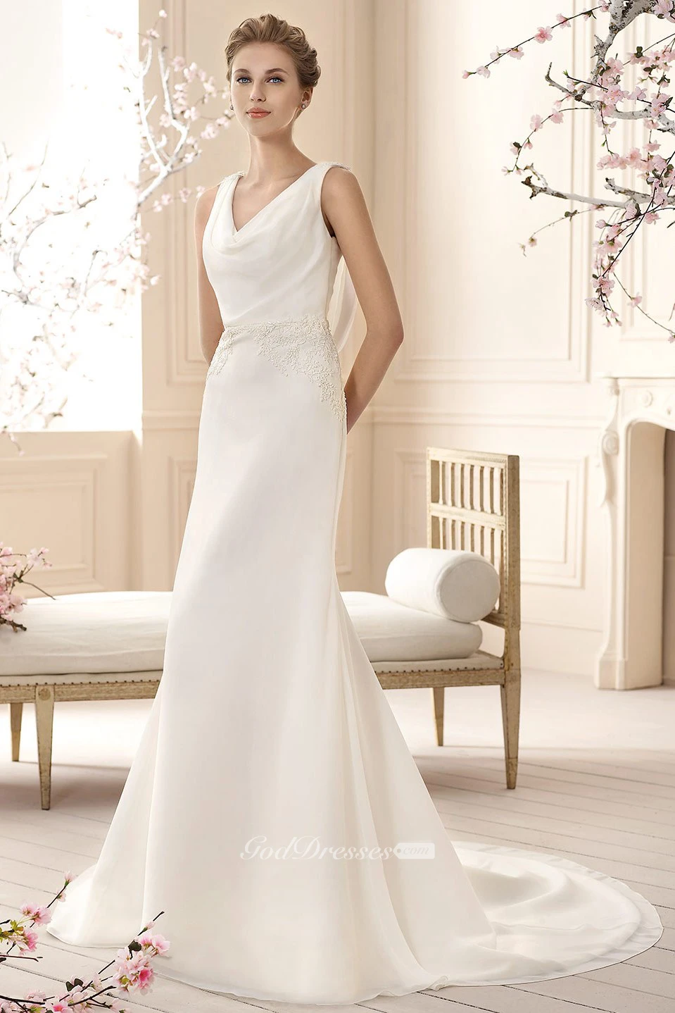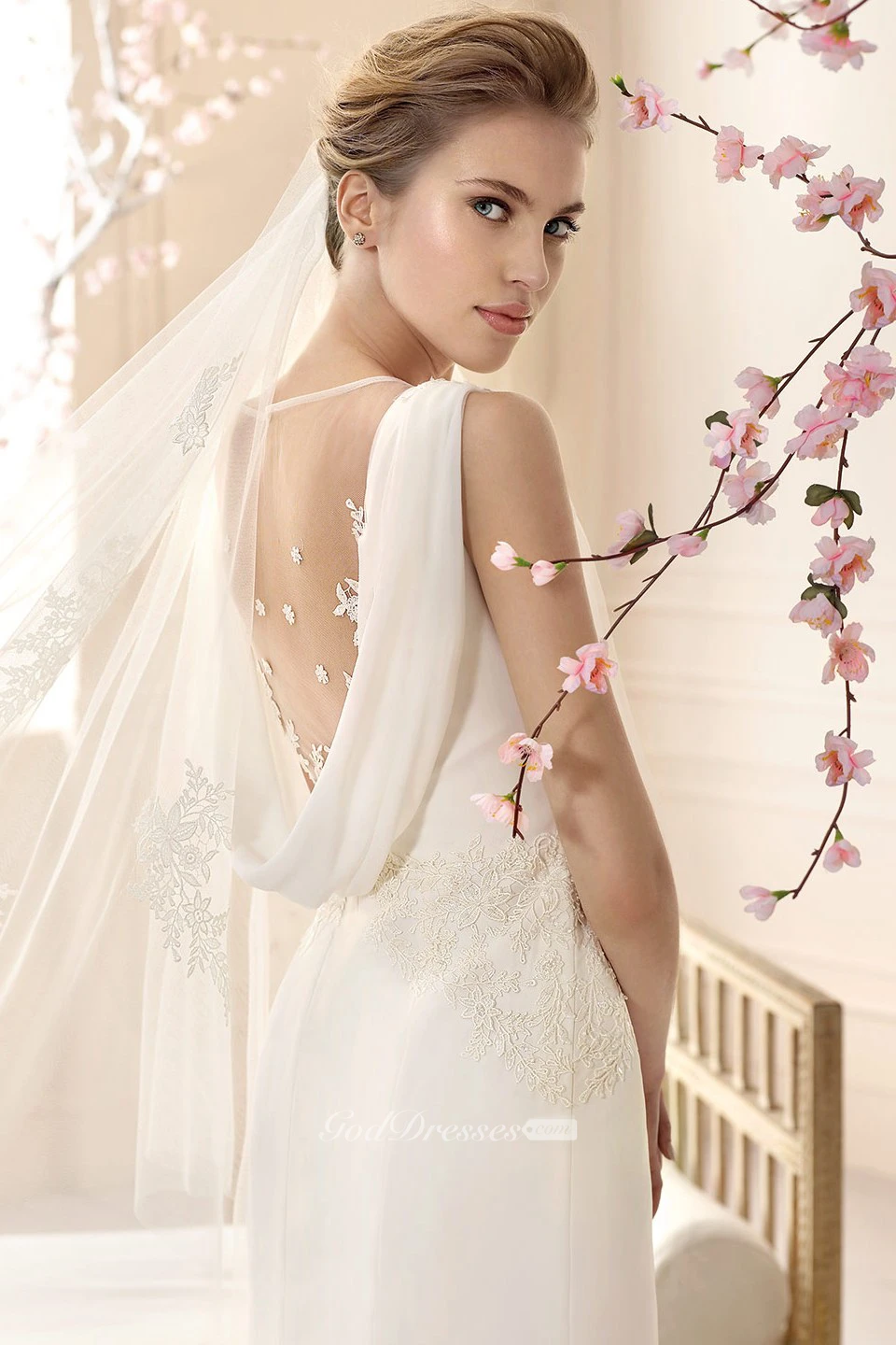 Sheath Cowl-Neck Floor-Length Appliqued Sleeveless Chiffon Wedding Dress