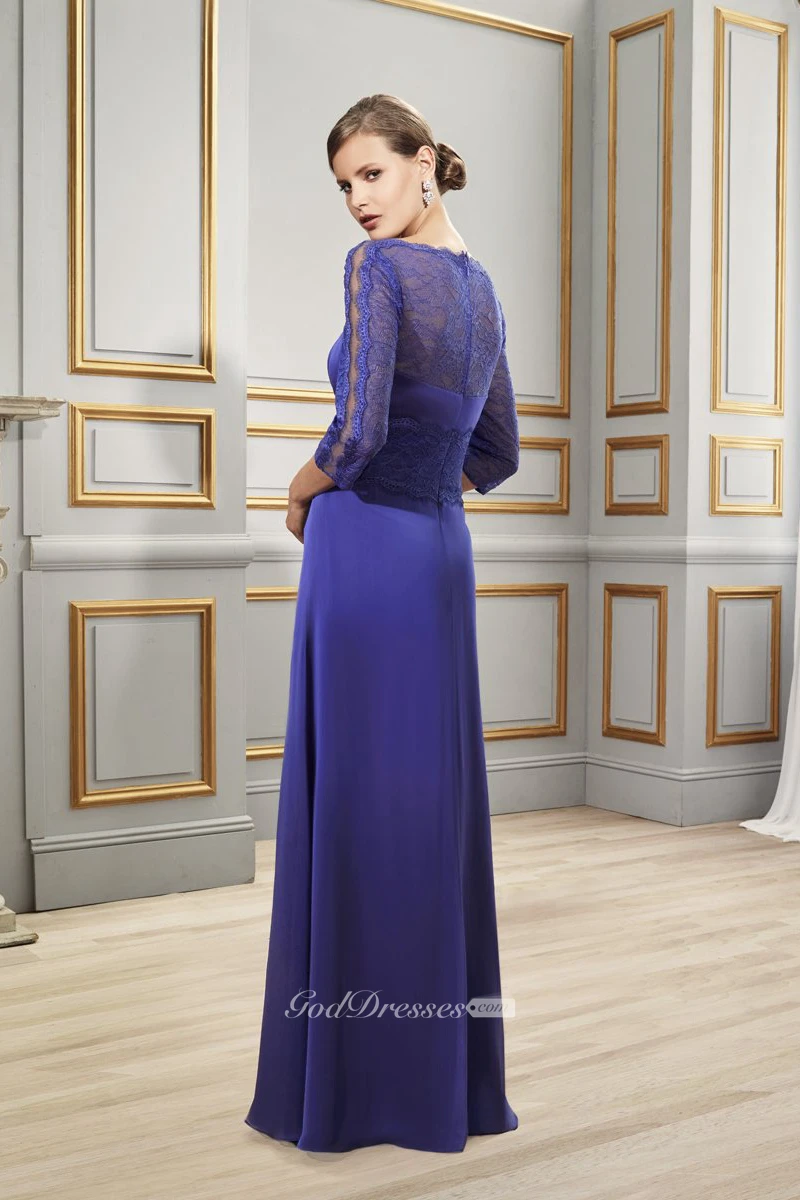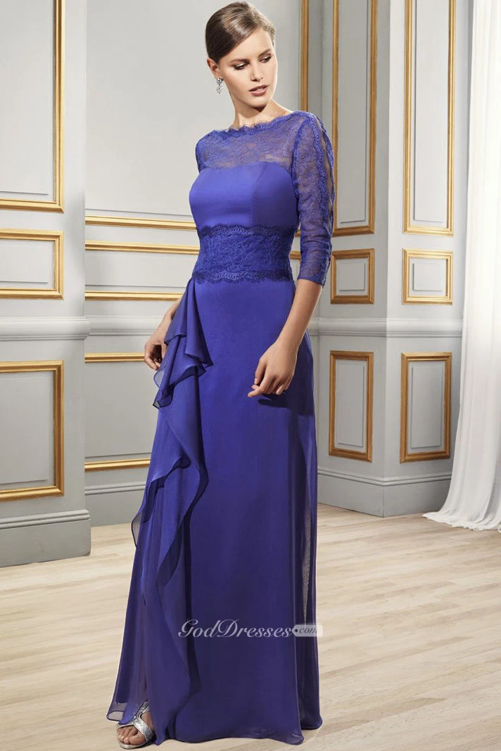 Sheath Draped Jewel-Neck 3-4-Sleeve Long Tulle&Satin Formal Dress With Lace