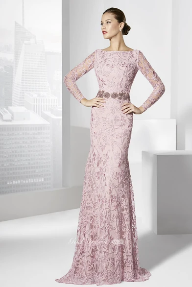 Sheath Embroidered Jewel-Neck Floor-Length Long-Sleeve Prom Dress