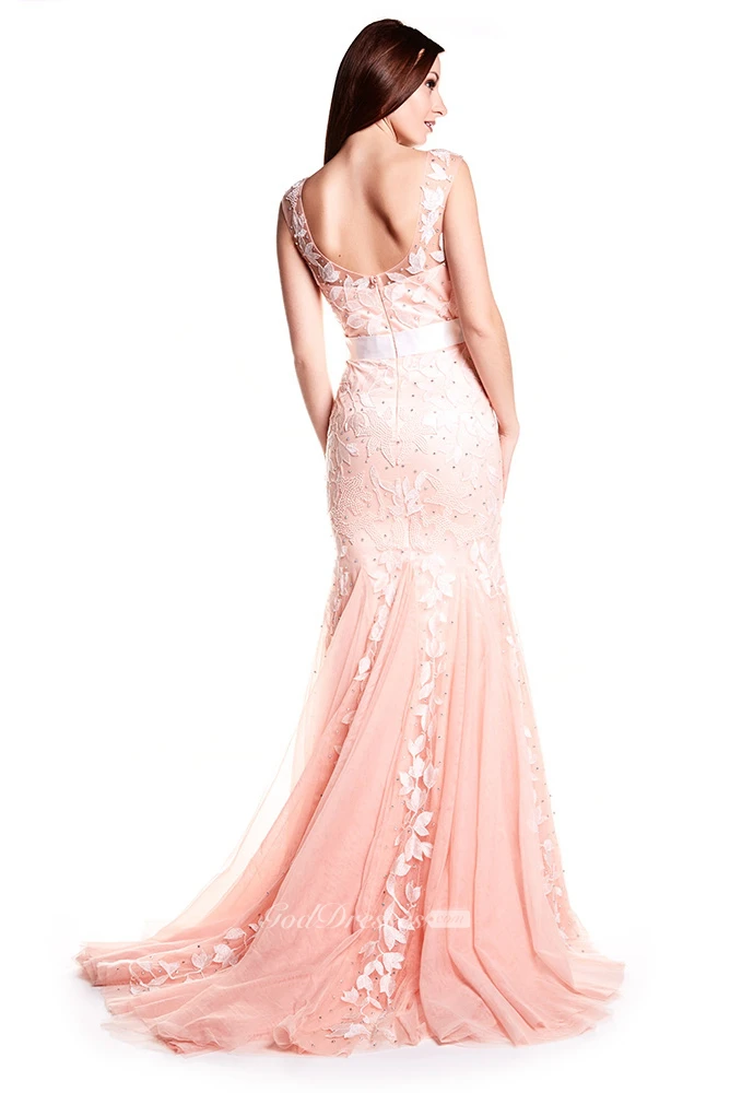 Sheath Floor-Length Bateau-Neck Embroidered Cap-Sleeve Tulle&Satin Prom Dress With Ribbon
