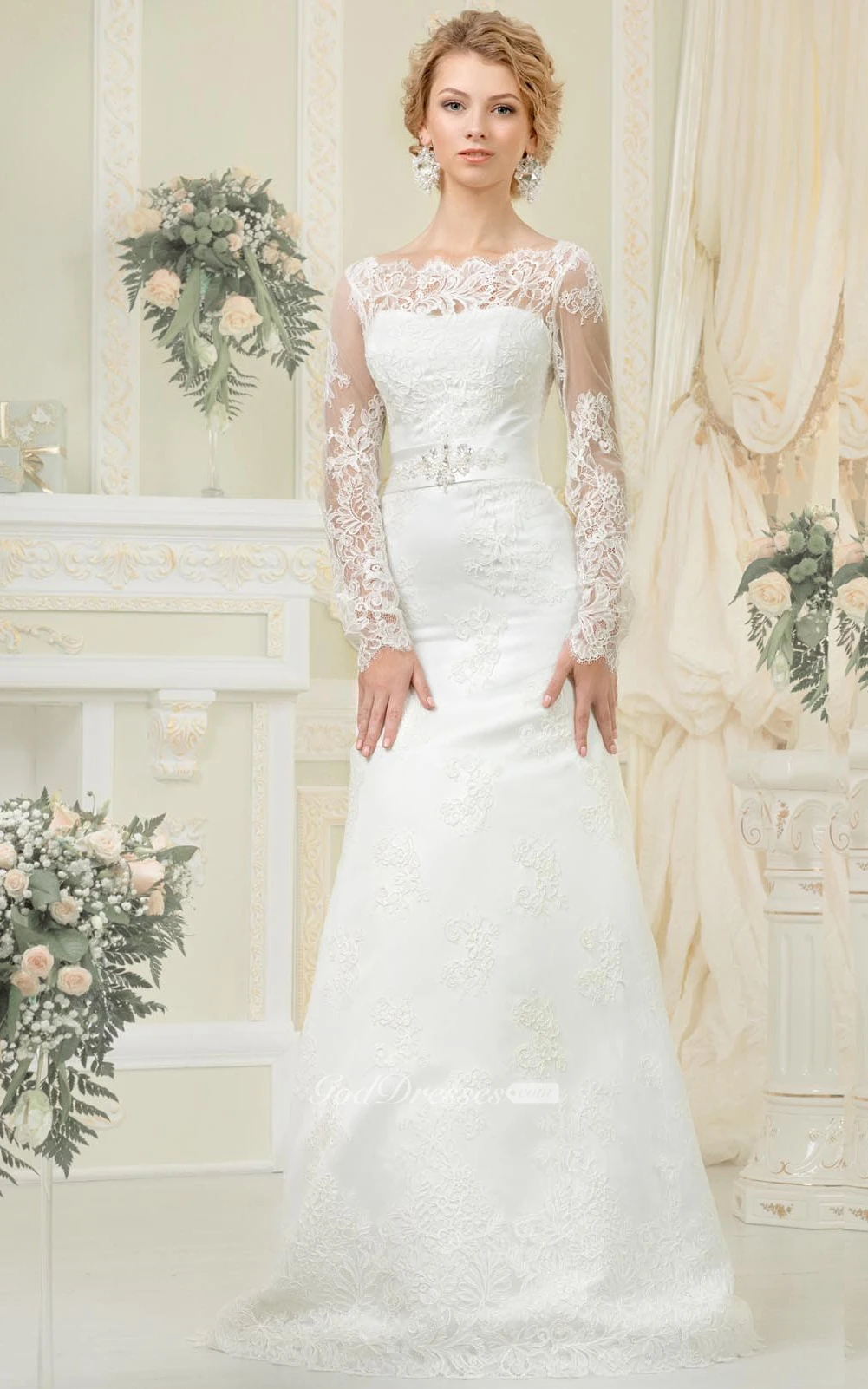 Sheath Floor-Length Bateau-Neck Illusion-Sleeve Lace-Up Lace Dress With Sash And Beading
