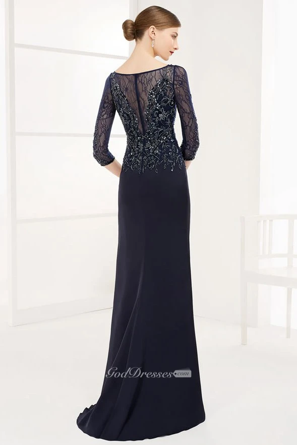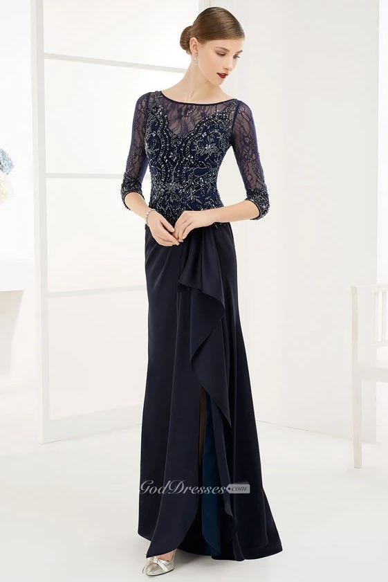 Sheath Floor-Length Beaded Half-Sleeve Scoop-Neck Chiffon Prom Dress With Draping
