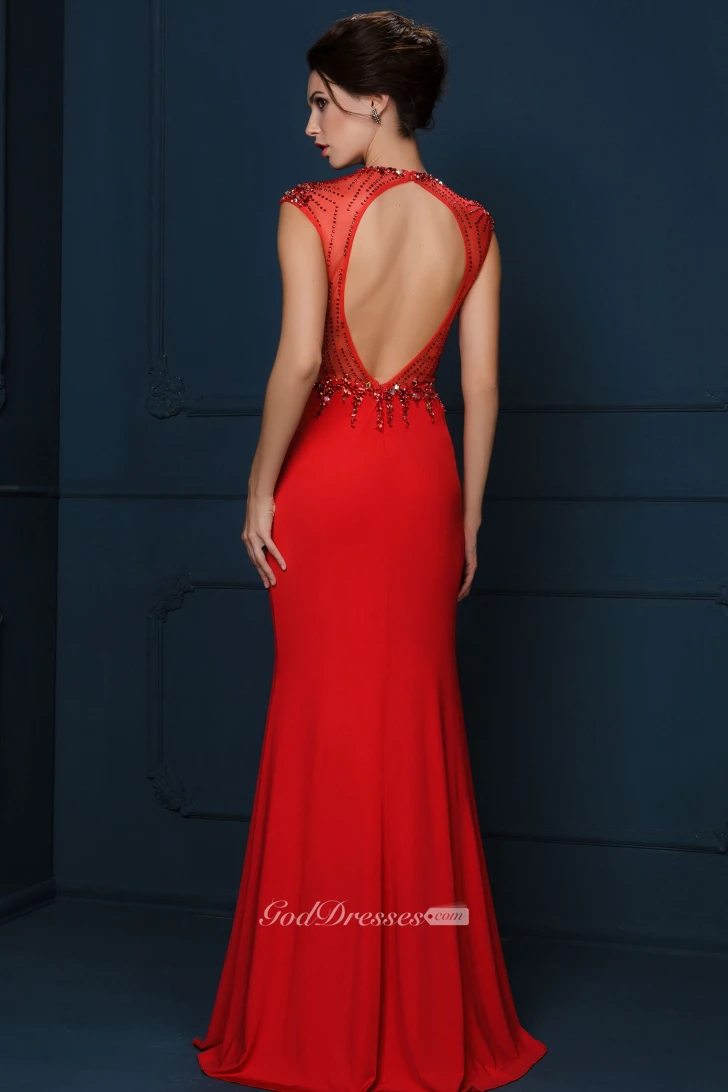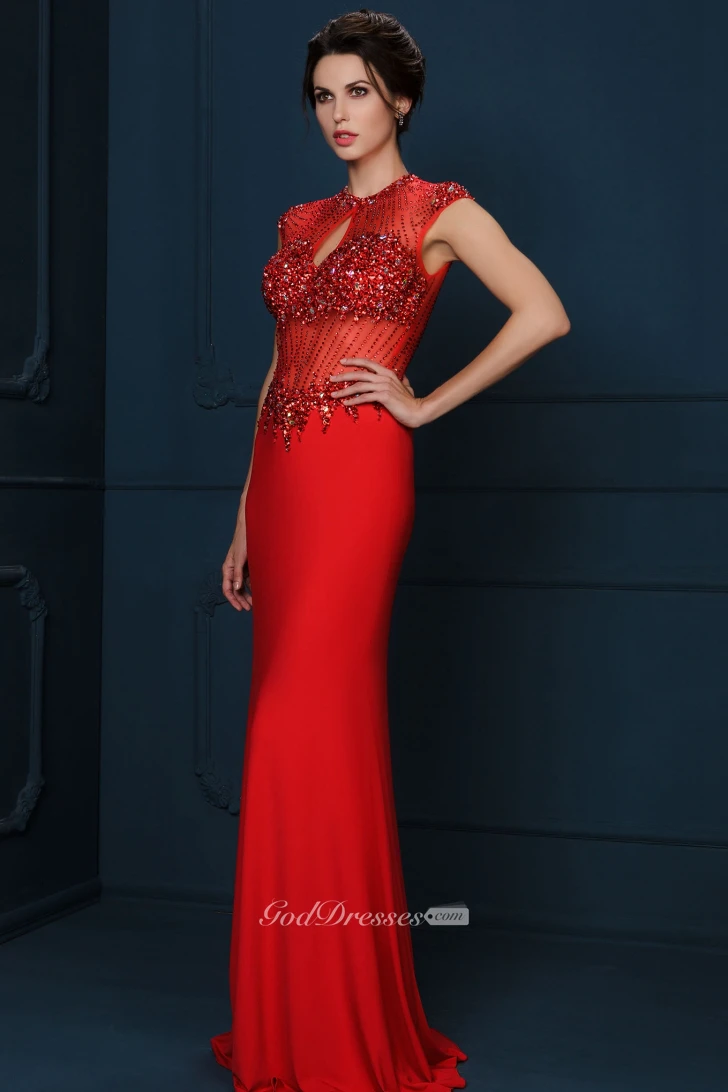 Sheath Floor-Length Crystal Cap-Sleeve Jewel-Neck Jersey Evening Dress