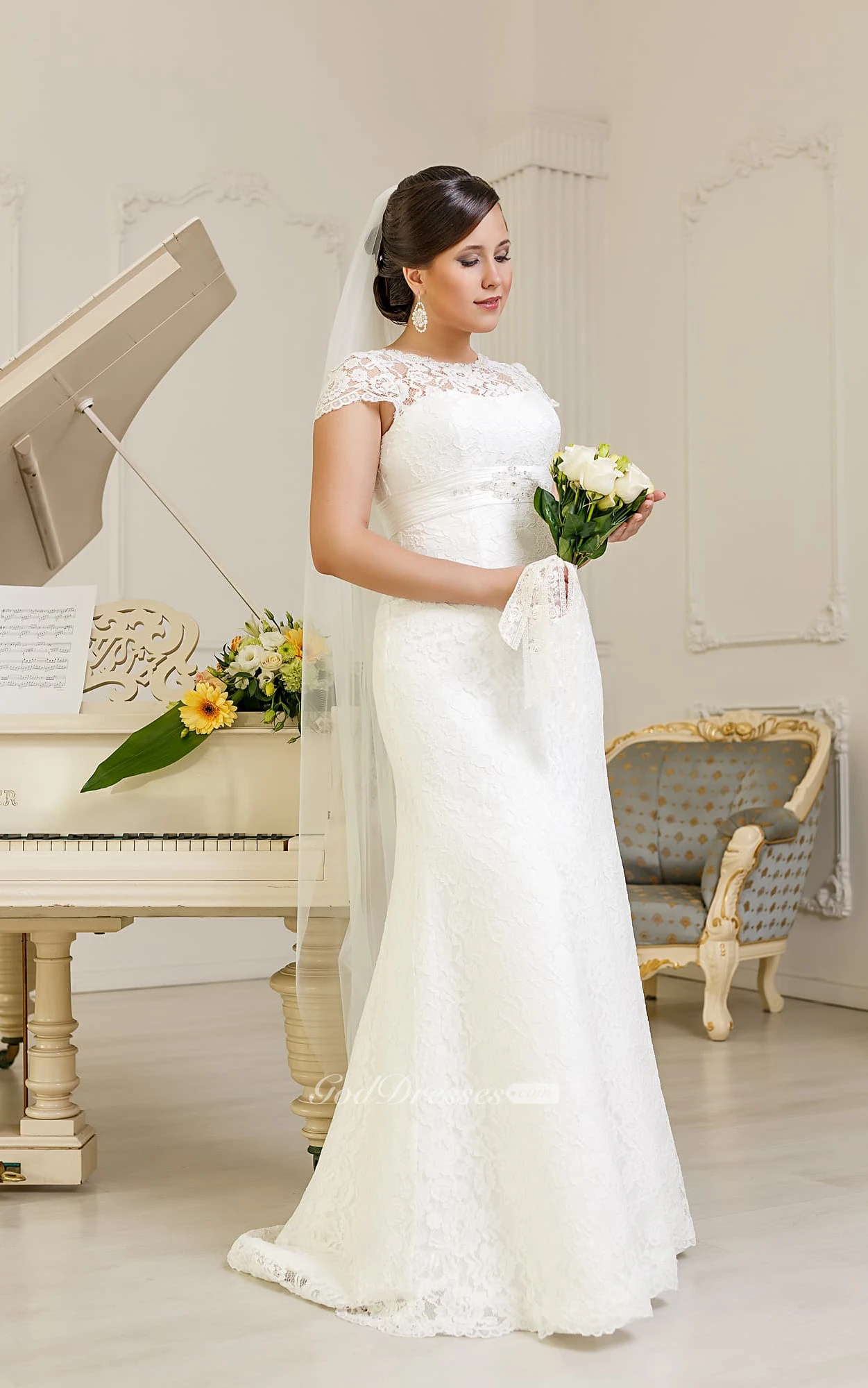 Sheath Floor-Length Jewel-Neck Cap-Sleeve Corset-Back Lace Dress With Sash And Beading