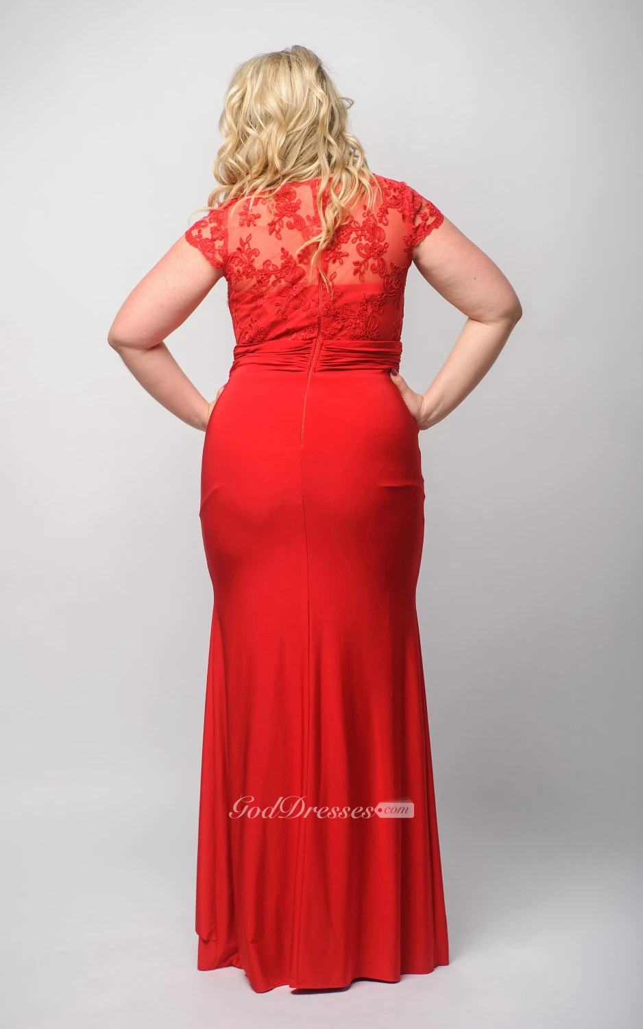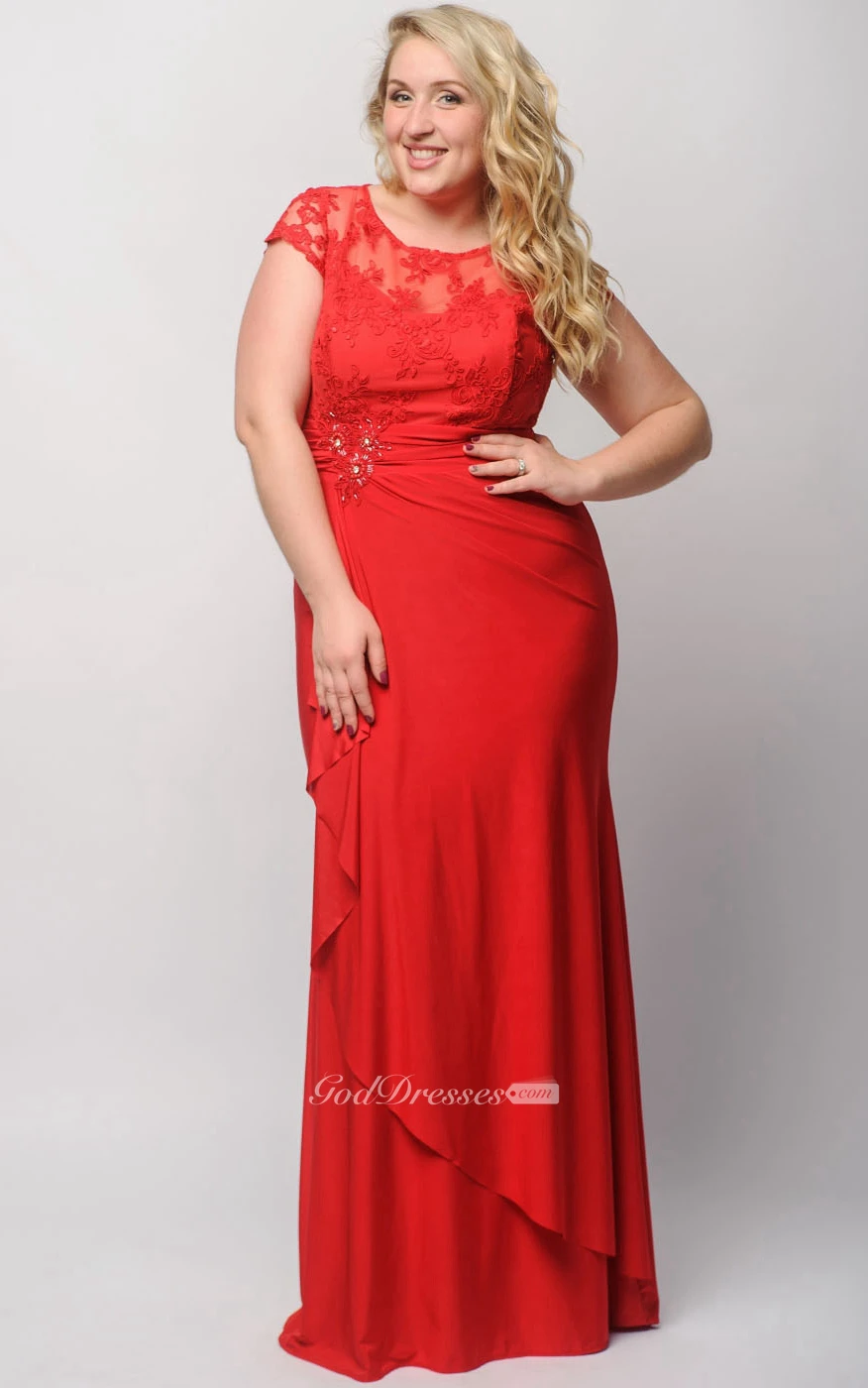 Sheath Floor-Length Jewel Short Sleeve Jersey Pleats Appliques Zipper Dress