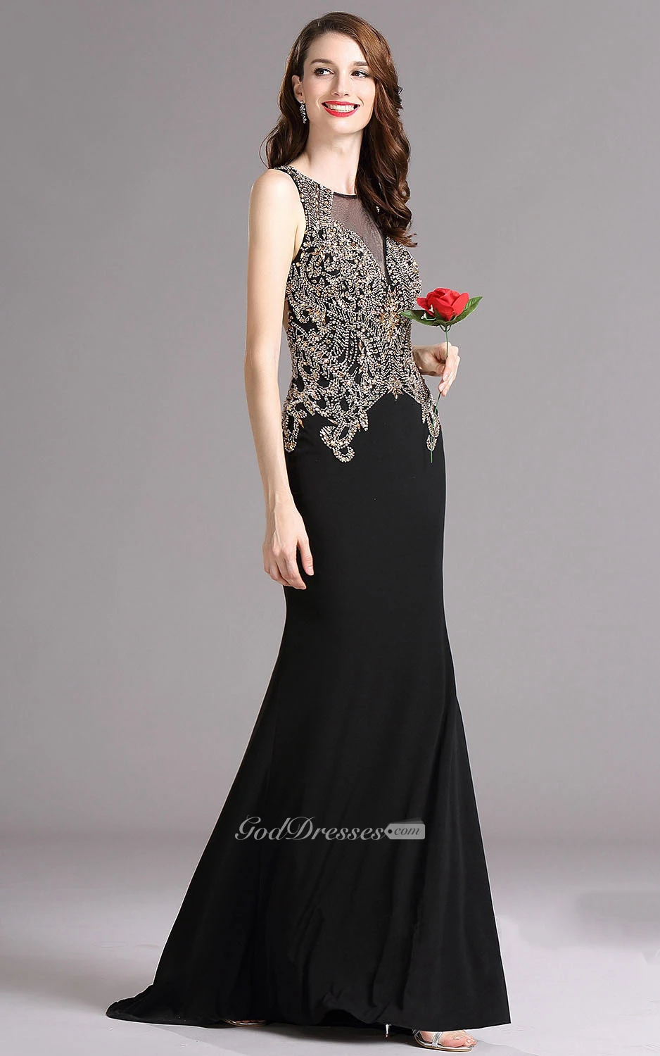 Sheath Floor-Length Jewel Sleeveless Jersey Beading Keyhole Dress