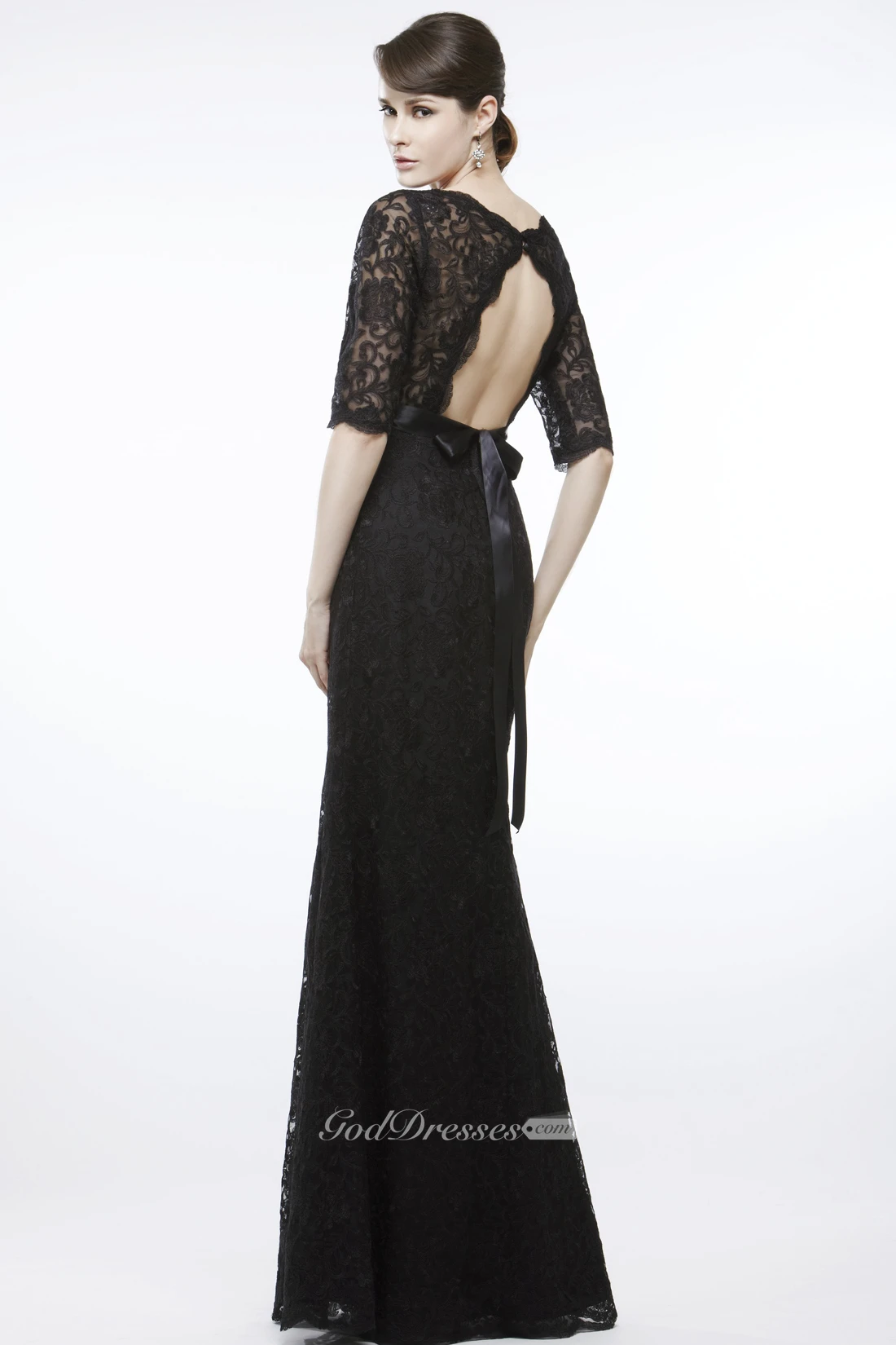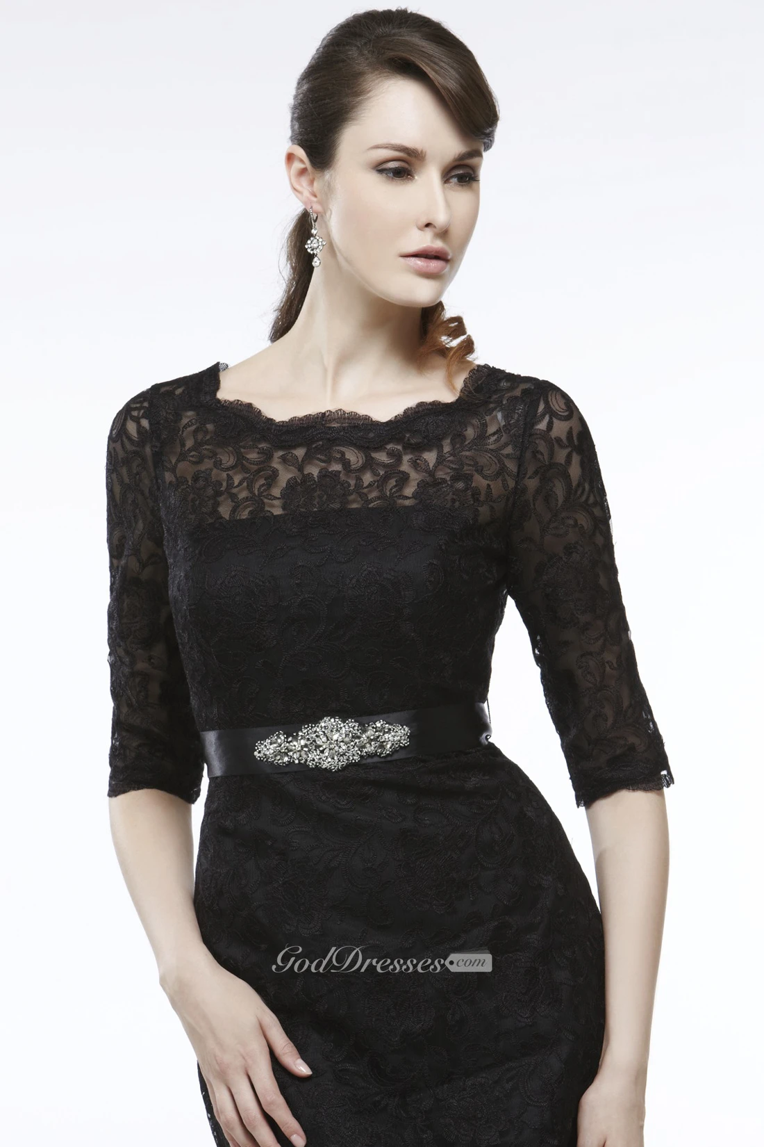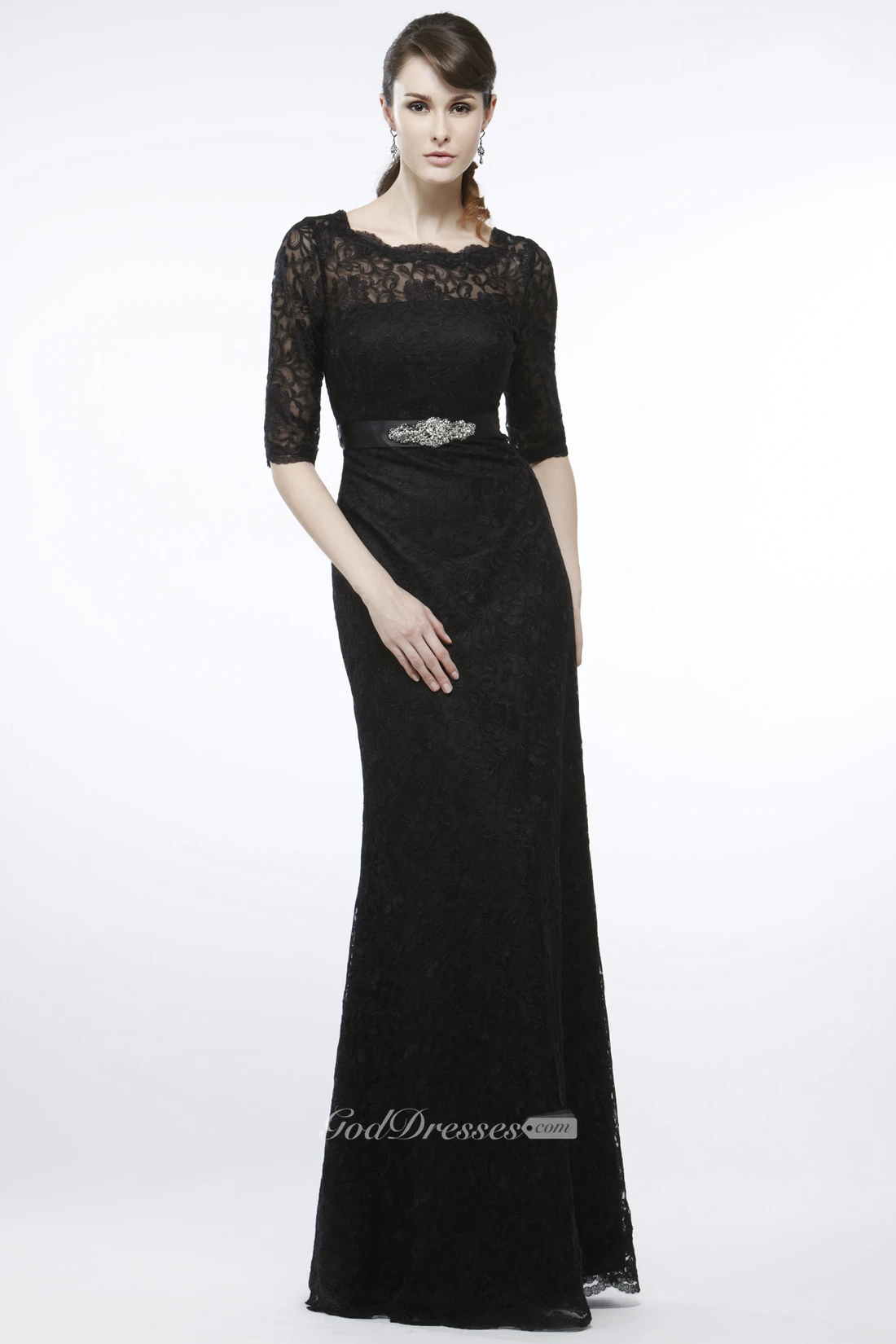 Sheath Floor-Length Jeweled Half-Sleeve Bateau-Neck Lace Prom Dress With Appliques And Ribbon