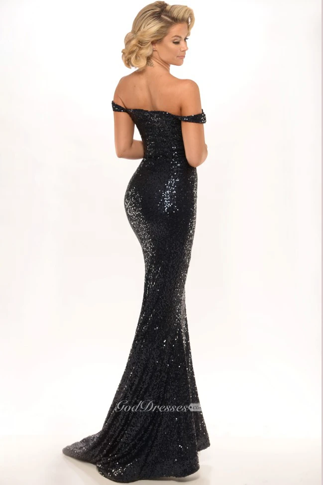 Sheath Floor-Length Off-The-Shoulder Sequins Prom Dress With Zipper Back And Sweep Train