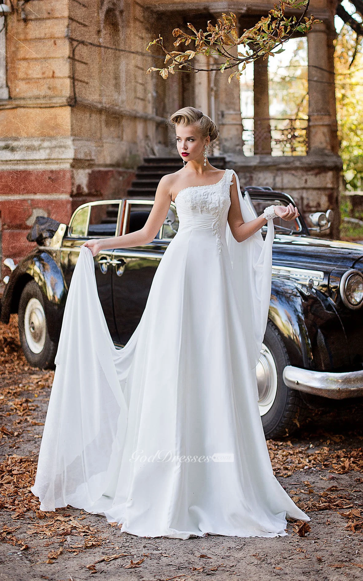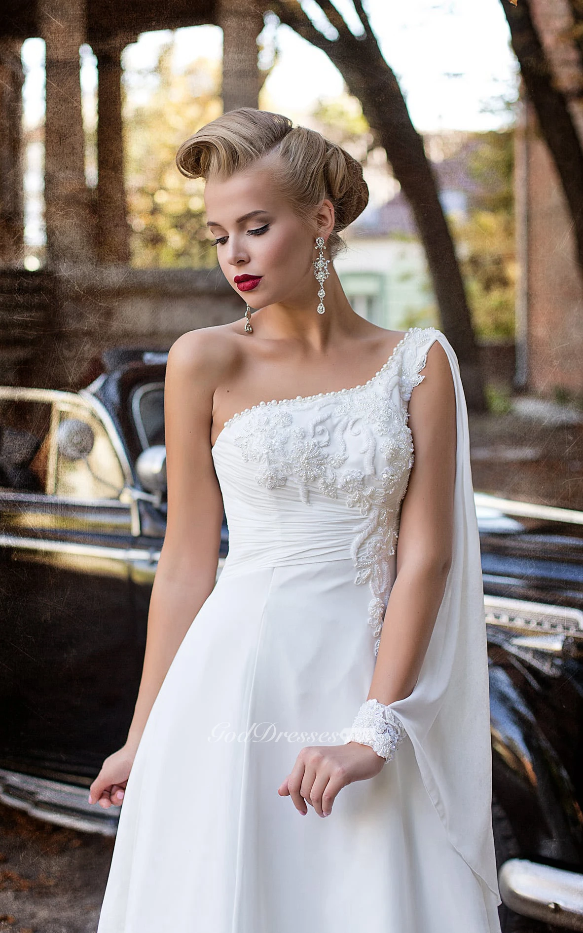 Sheath Floor-Length One-Shoulder Sleeveless Empire Lace-Up Chiffon Dress With Appliques And Beading