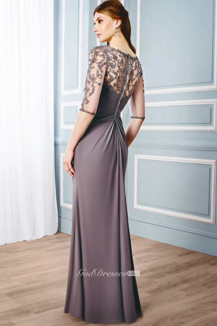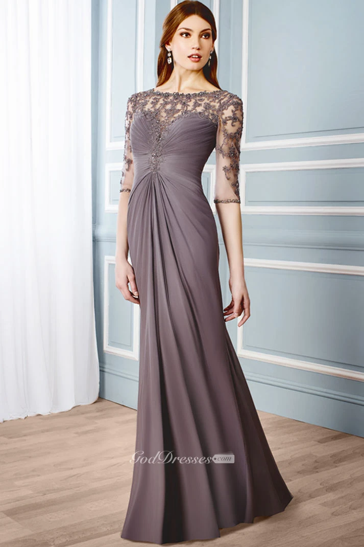 Sheath Floor-Length Ruched Bateau Neck Half Sleeve Chiffon Formal Dress