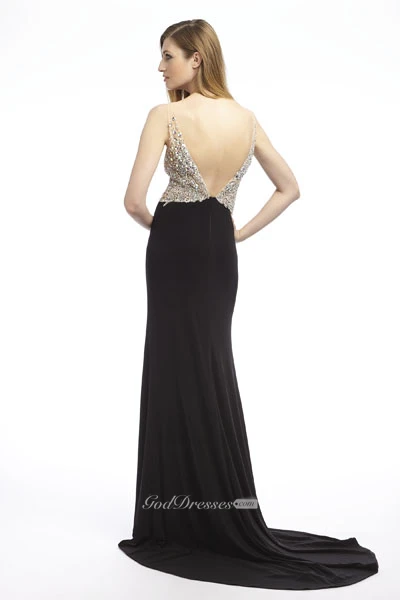 Sheath Floor-Length V-Neck Beaded Sleeveless Jersey Prom Dress With Split Front