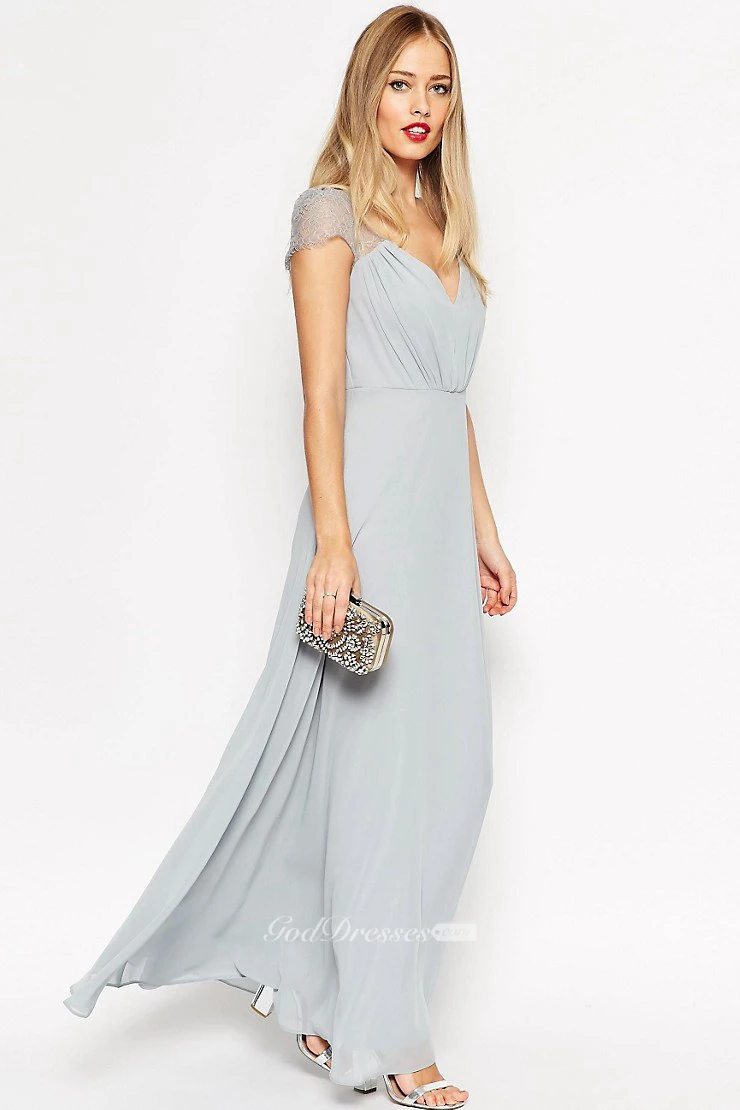 Sheath Floor-Length V-Neck Cap Sleeve Ruched Chiffon Bridesmaid Dress