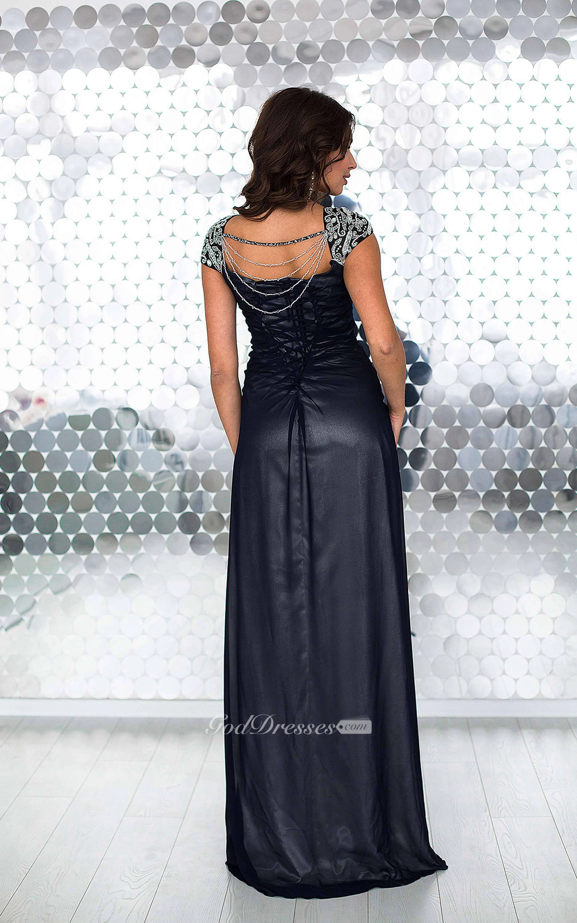 Sheath Floor-Length V-Neck Short Sleeve Chiffon Pleats Appliques Zipper Dress
