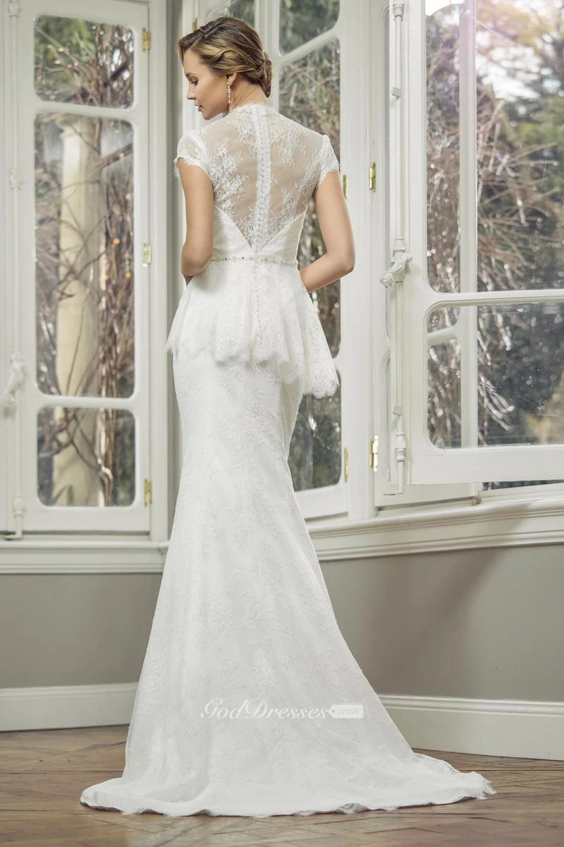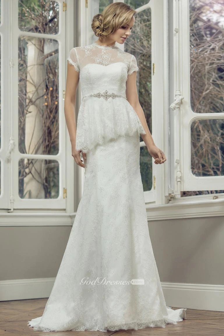 Sheath High Neck T-Shirt-Sleeve Jeweled Floor-Length Lace Wedding Dress With Peplum And Illusion