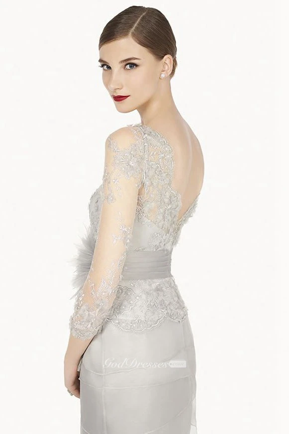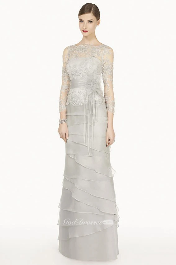 Sheath Jewel-Neck 3-4-Sleeve Appliqued Floor-Length Prom Dress With Beading And Flower