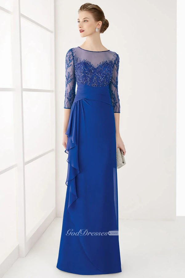 Sheath Jewel-Neck 3-4-Sleeve Long Draped Chiffon Prom Dress With Beading And Sequins