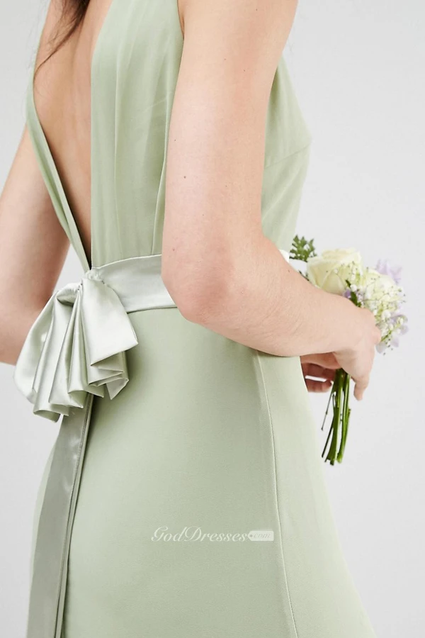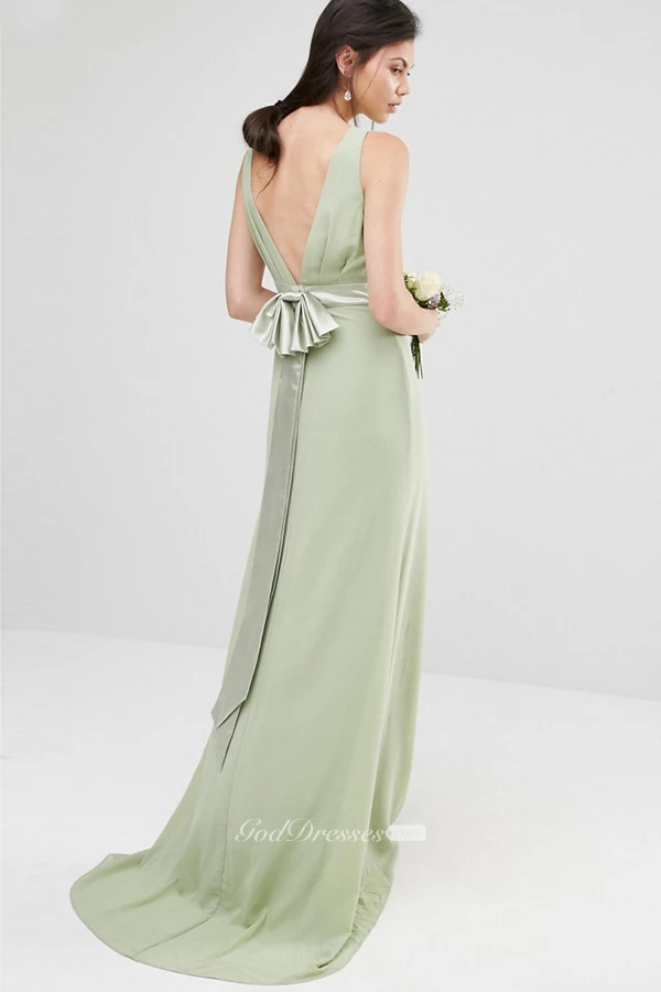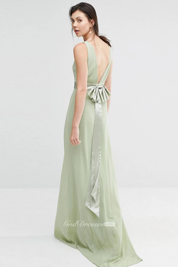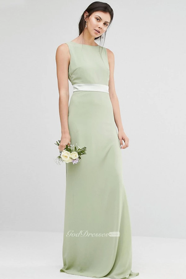 Sheath Jewel-Neck Floor-Length Sleeveless Chiffon Bridesmaid Dress With Ribbon And V Back