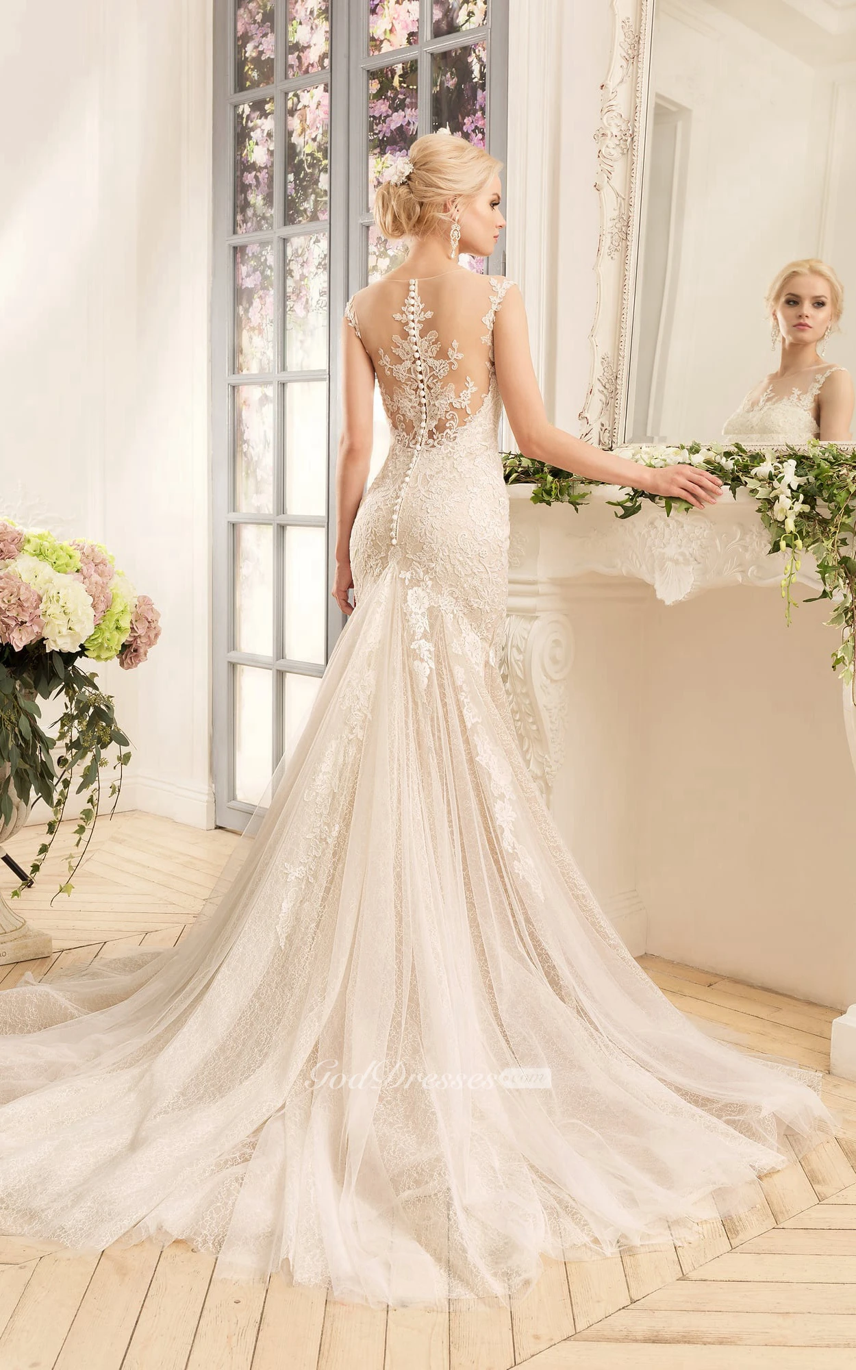 Sheath Long Bateau Cap-Sleeve Illusion Lace Tulle Dress With Appliques And Pleats