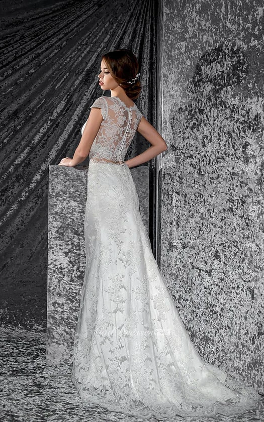 Sheath Long Cap-Sleeve Illusion Lace Dress With Appliques