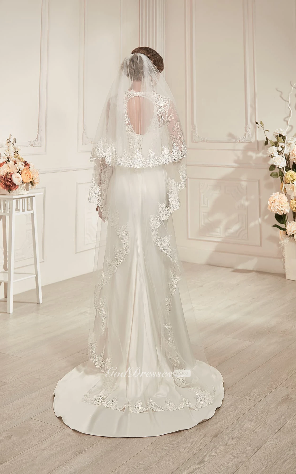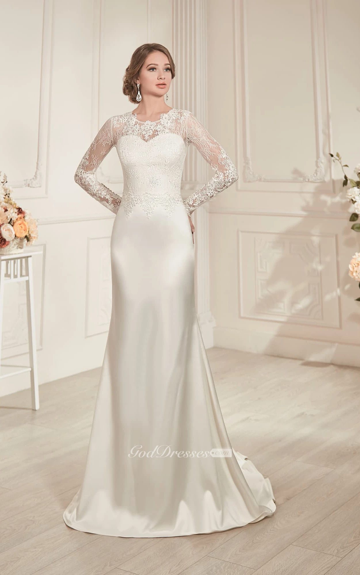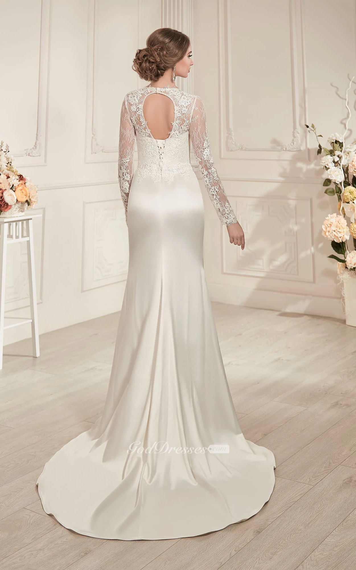 Sheath Long Jewel-Neck Illusion-Sleeve Lace-Up Satin Dress With Keyhole