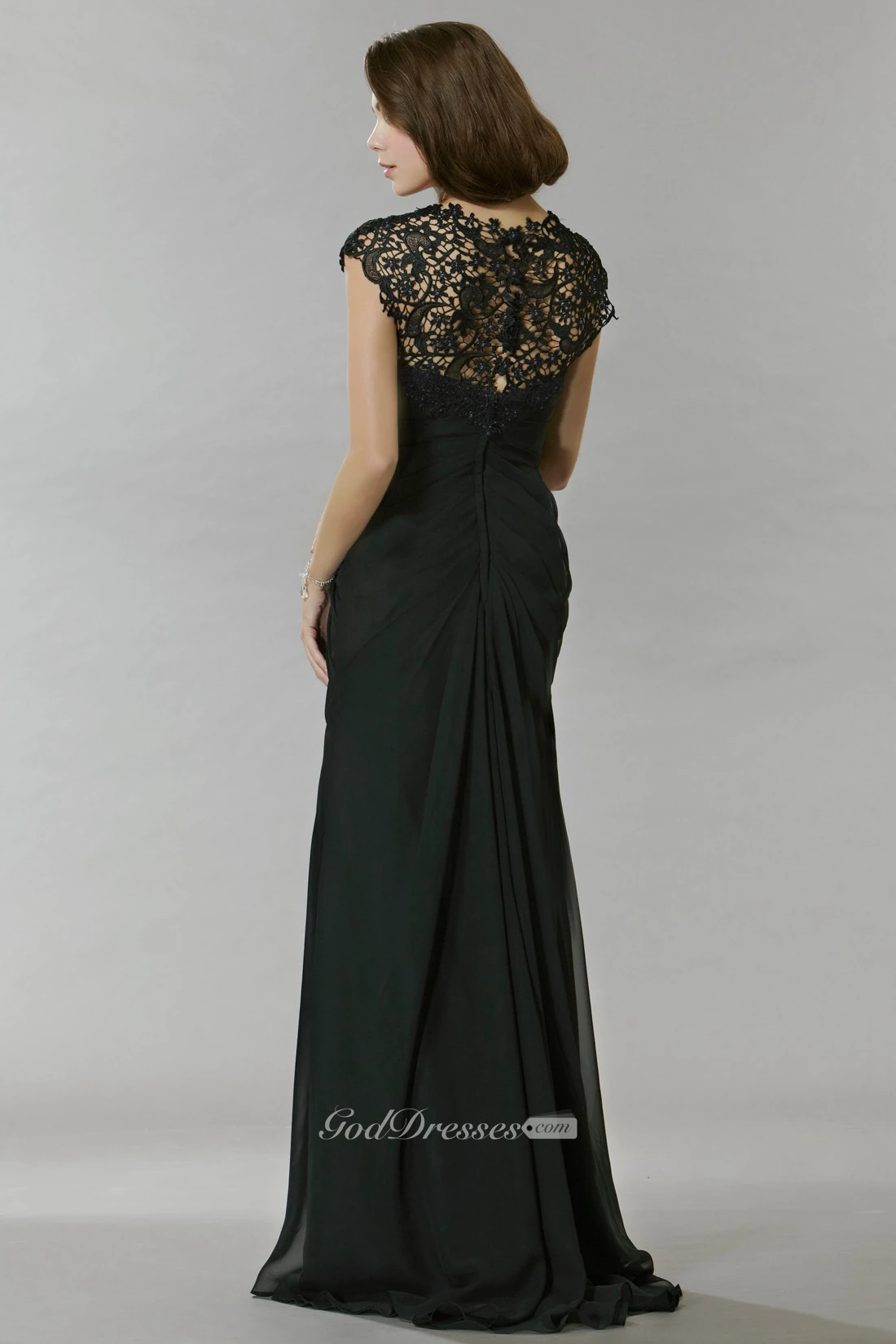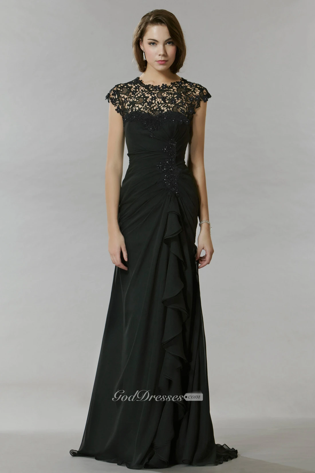 Sheath Long Lace Jewel Cap-Sleeve Chiffon Prom Dress With Beading And Draping
