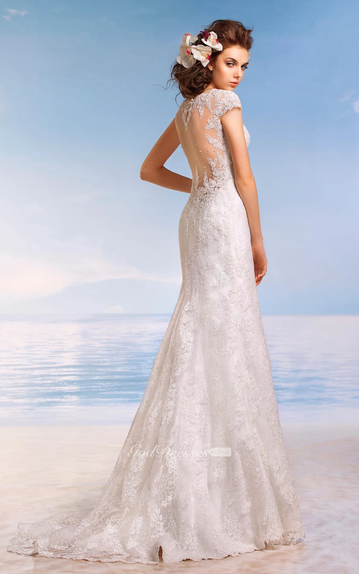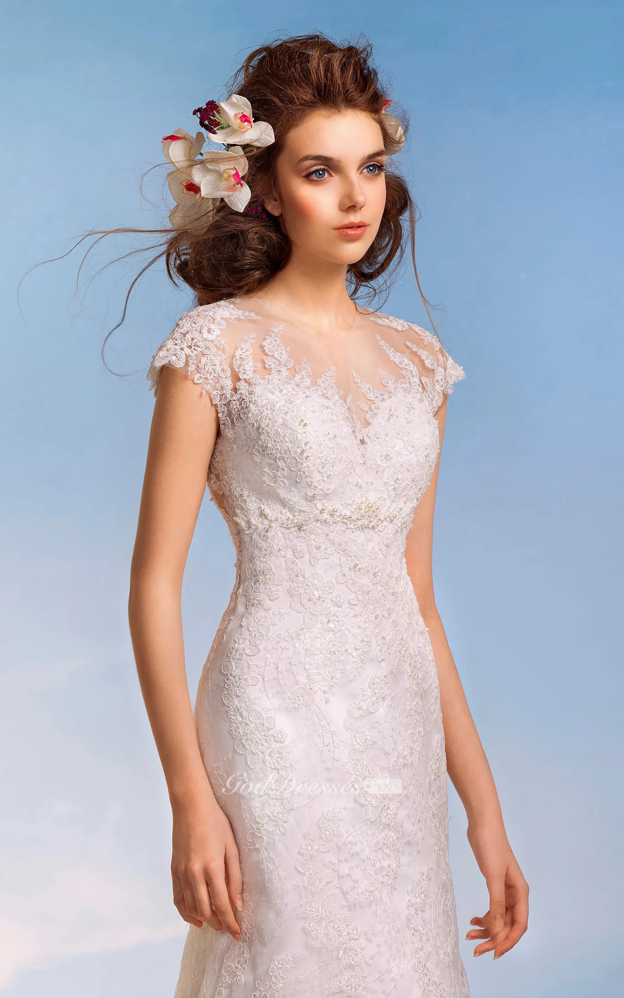 Sheath Long Scoop Cap-Sleeve Illusion Lace Dress With Appliques