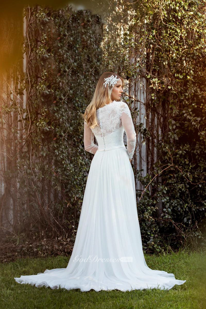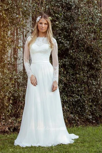 Sheath Long-Sleeve Jewel-Neck Chiffon Wedding Dress With Illusion