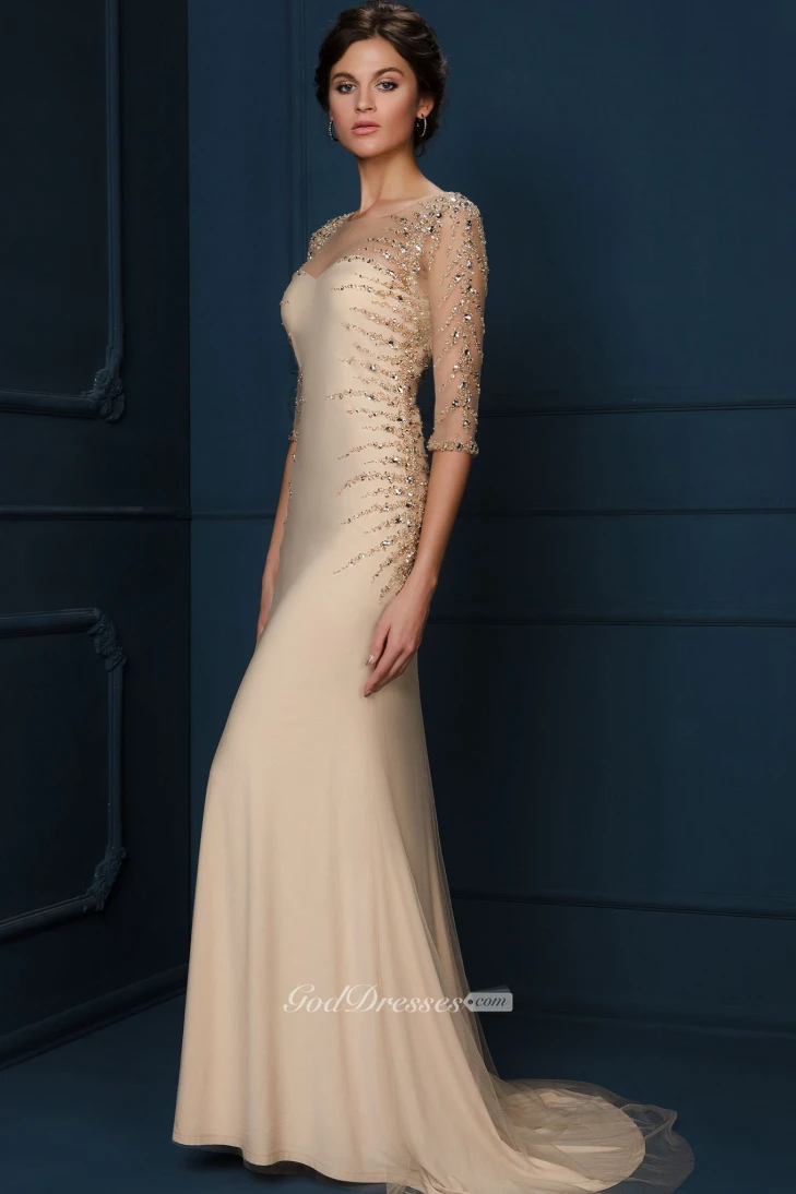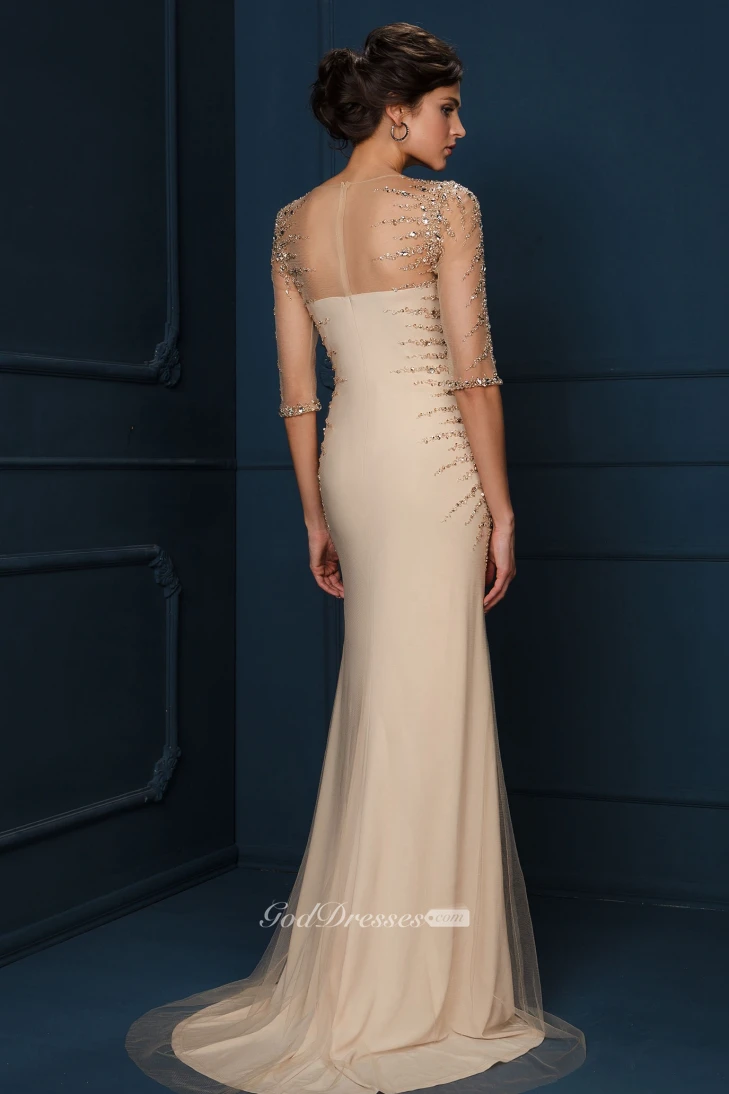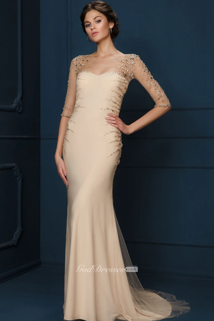 Sheath Long-Sleeve Long Scoop-Neck Beaded Tulle&Jersey Evening Dress