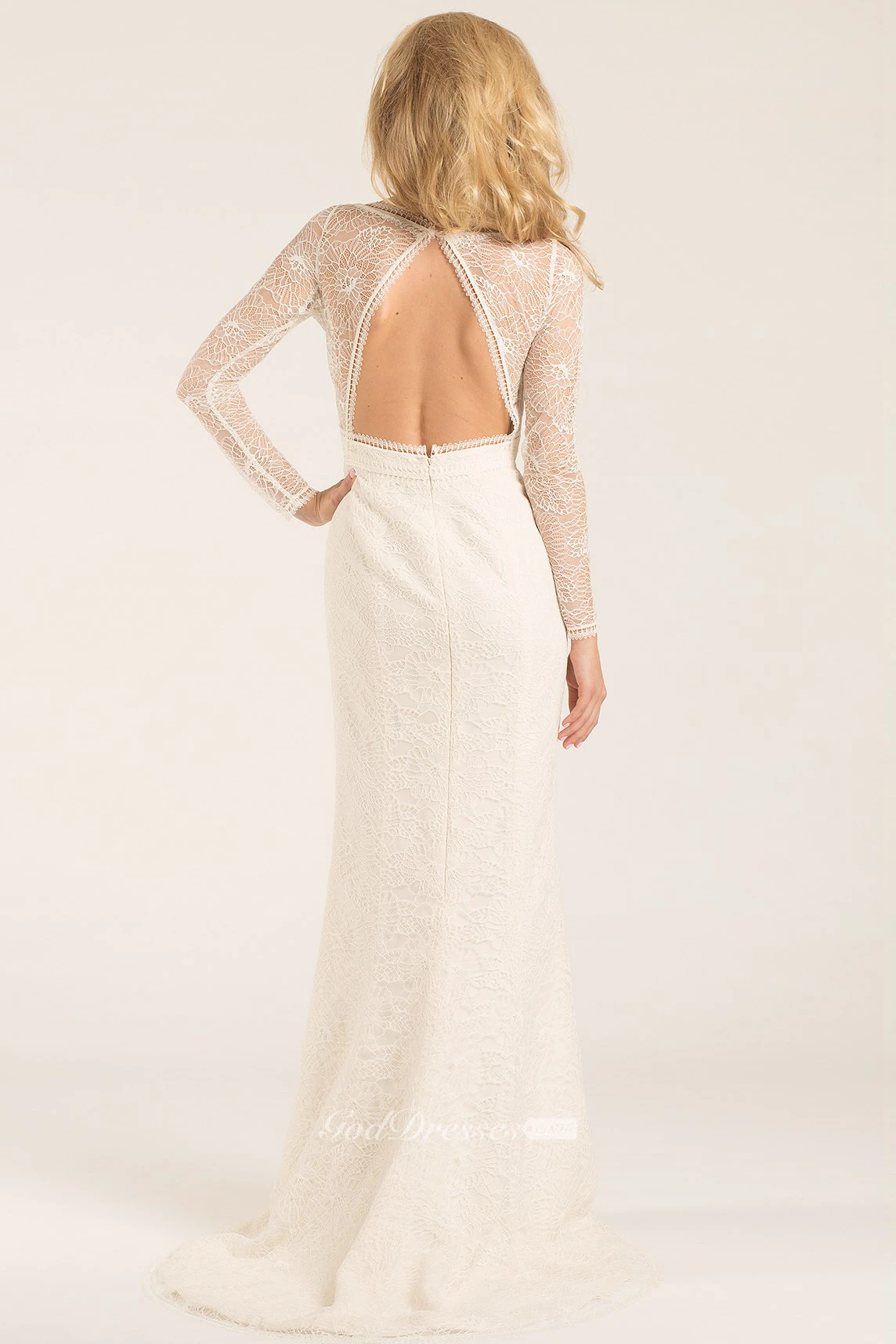 Sheath Long-Sleeve V-Neck Lace Wedding Dress With Keyhole