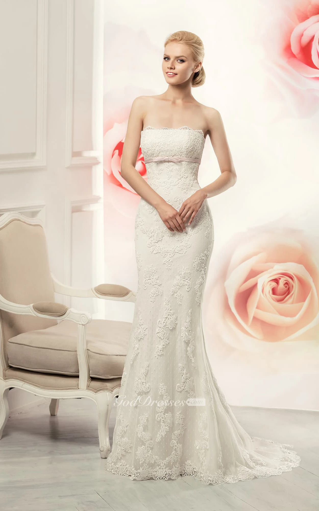Sheath Long Strapless Sleeveless Lace-Up Lace Dress With Appliques