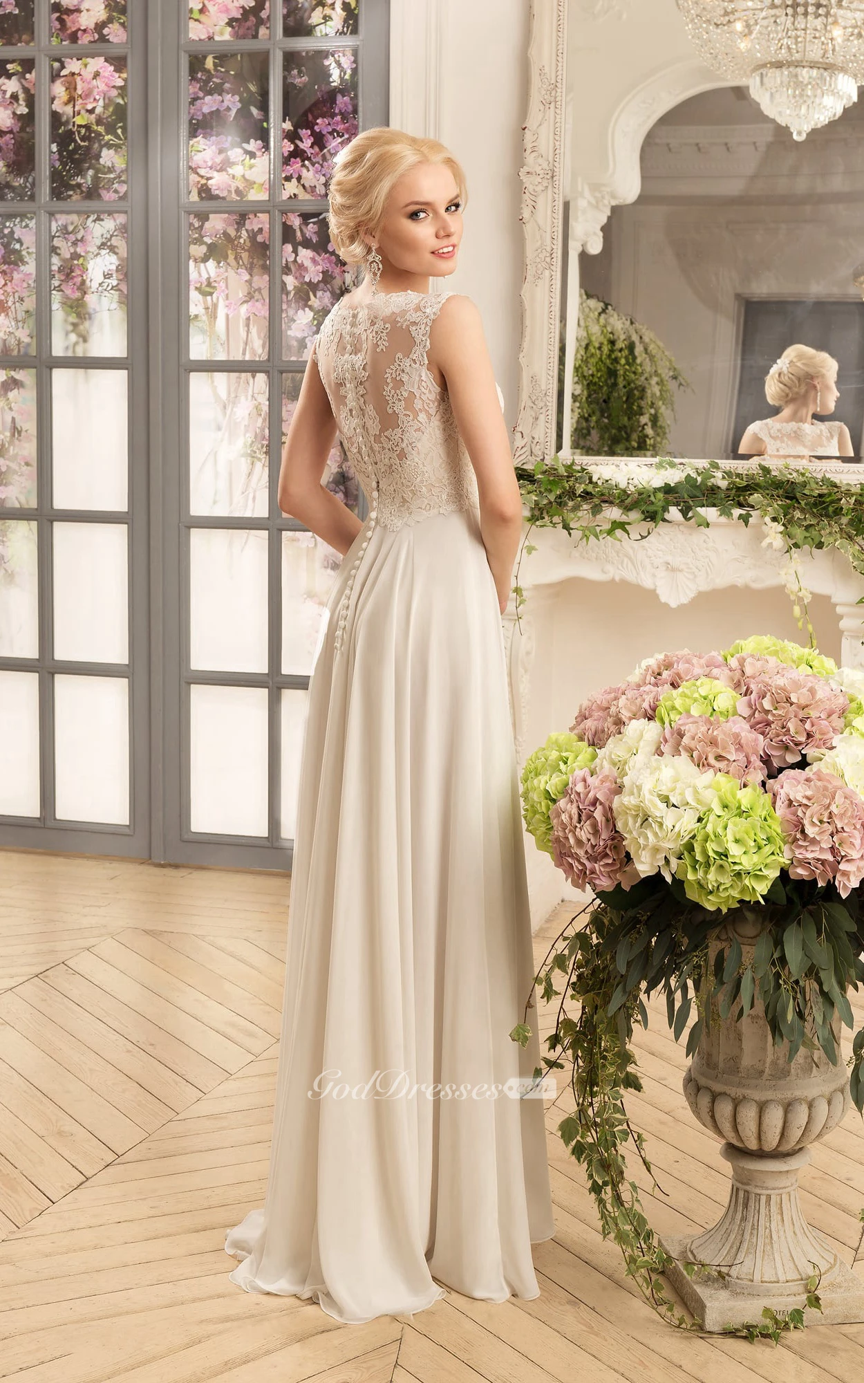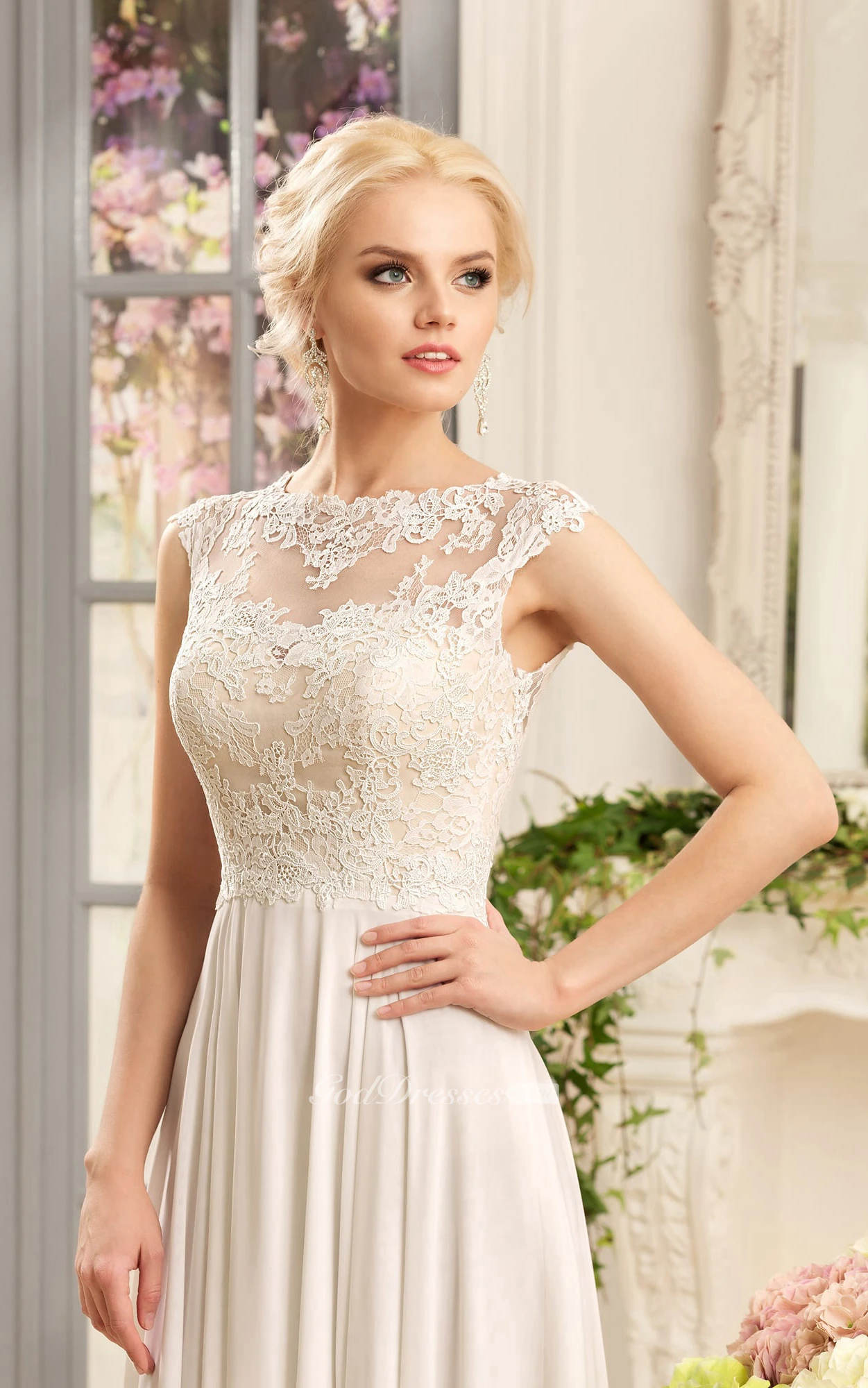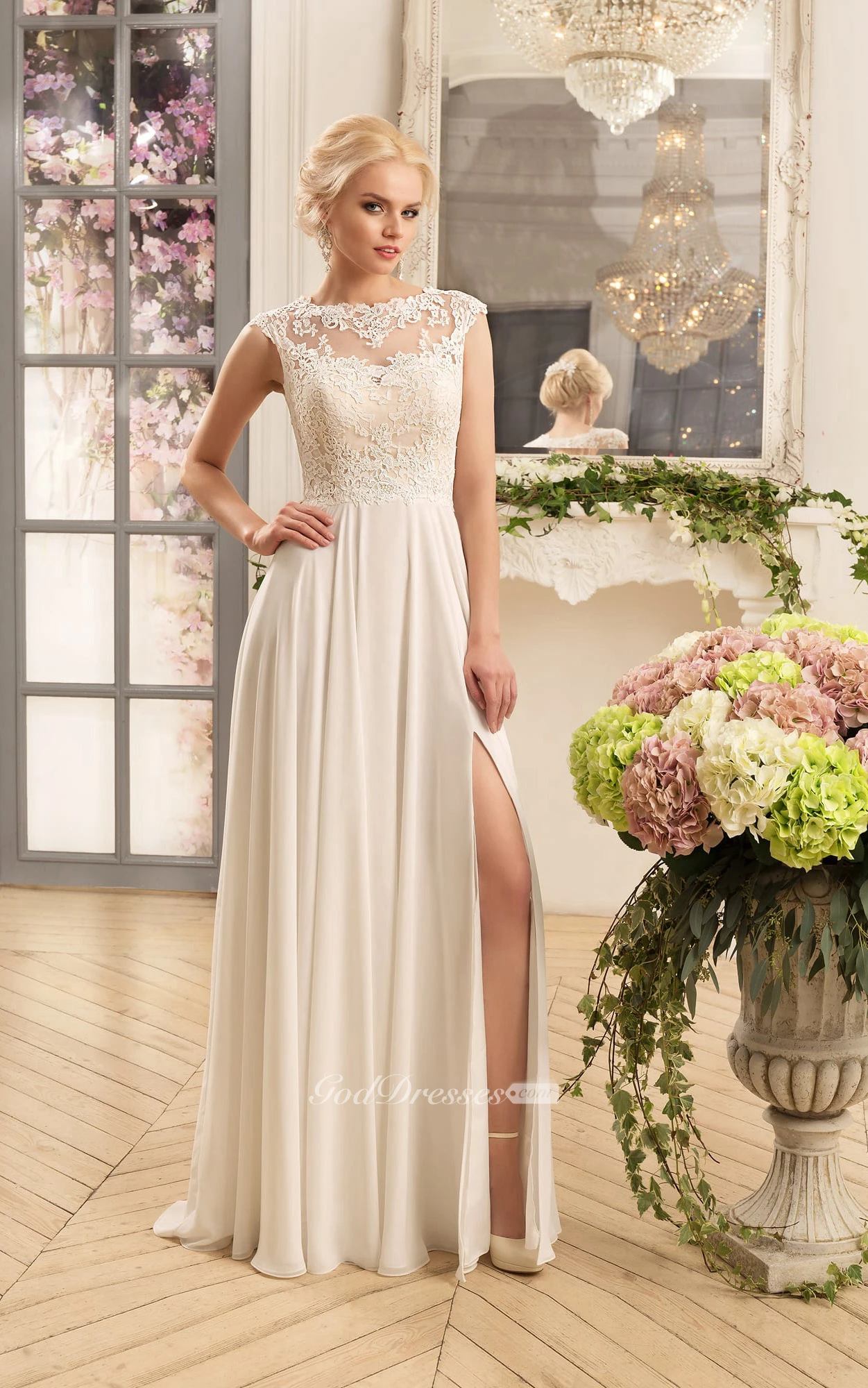 Sheath Maxi Bateau Cap-Sleeve Illusion Chiffon Dress With Split Front And Appliques