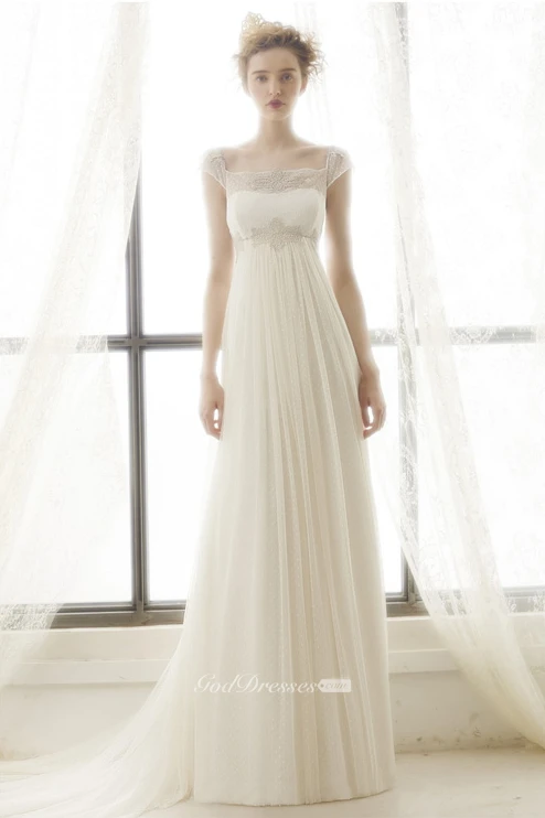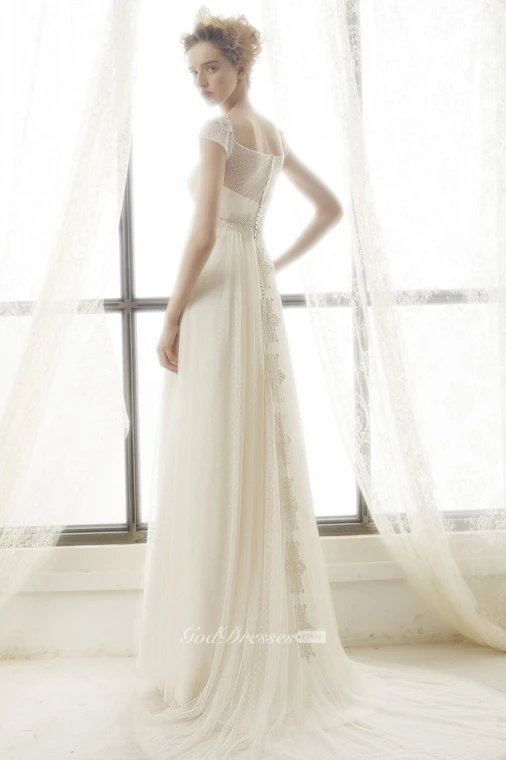 Sheath Maxi Cap-Sleeve Pleated Empire Square-Neck Tulle Wedding Dress With Appliques And Illusion