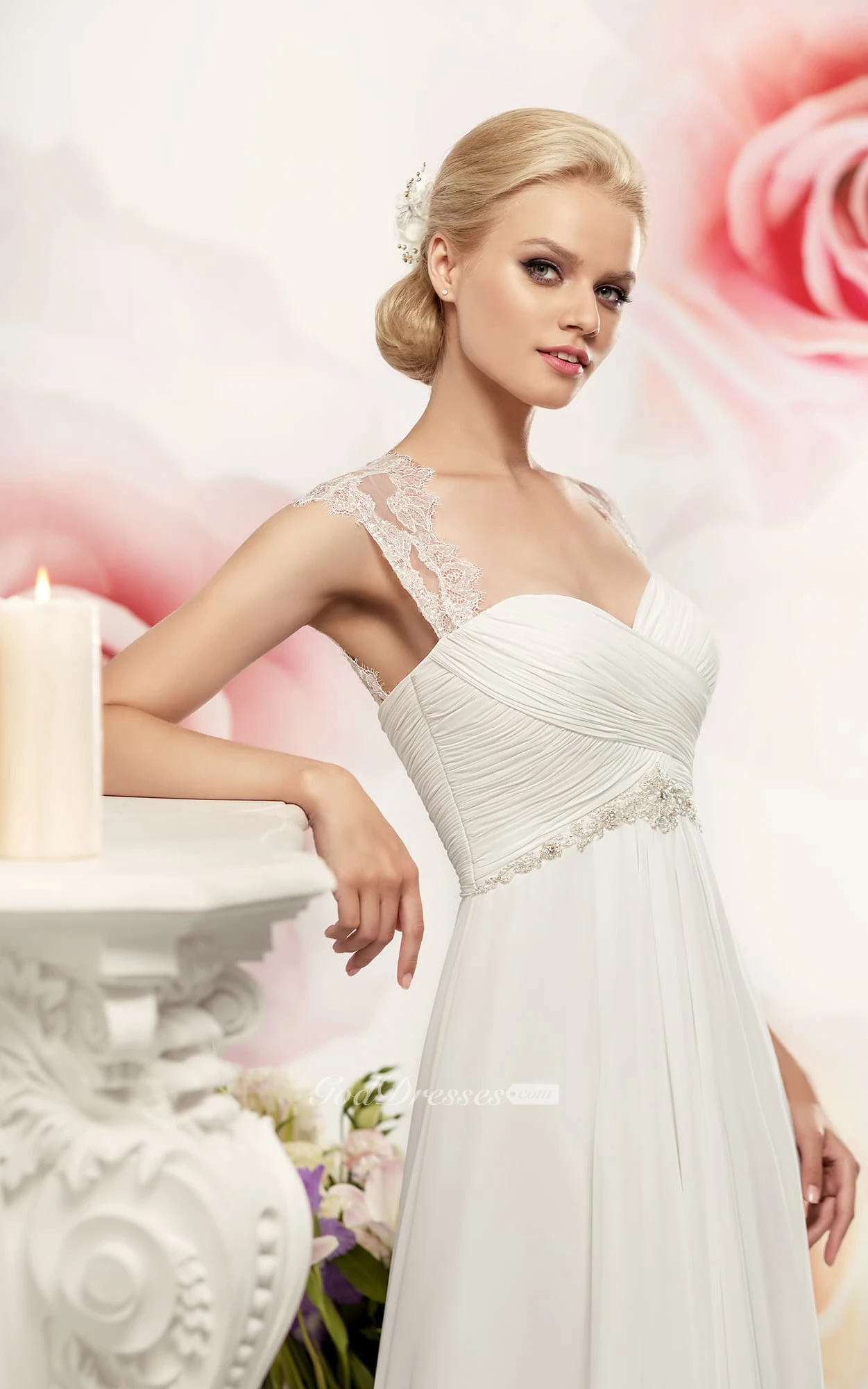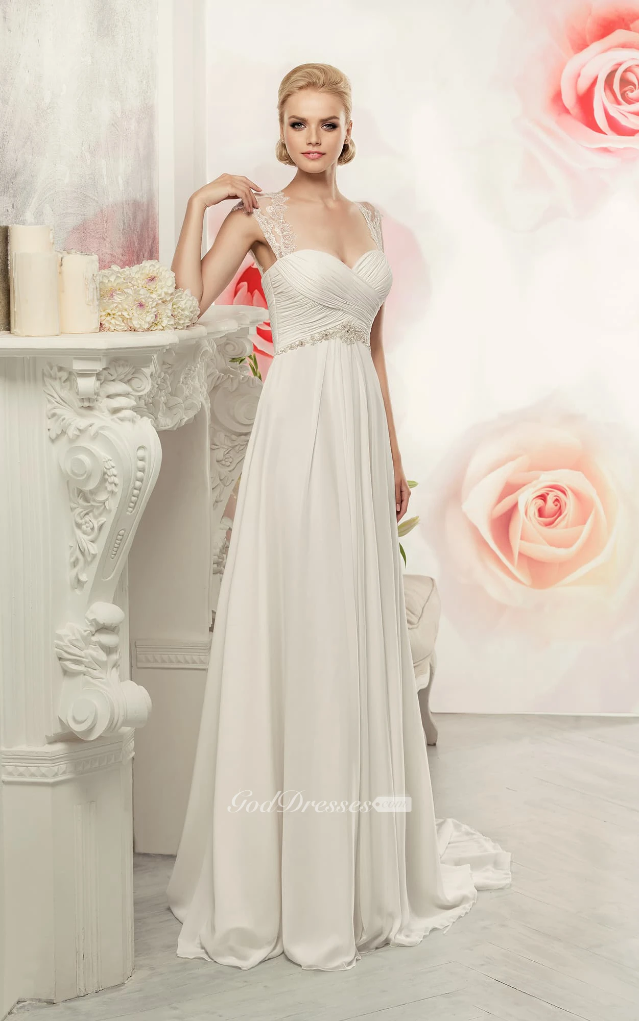 Sheath Maxi Queen-Anne Sleeveless Empire Keyhole Chiffon Dress With Criss Cross And Waist Jewellery