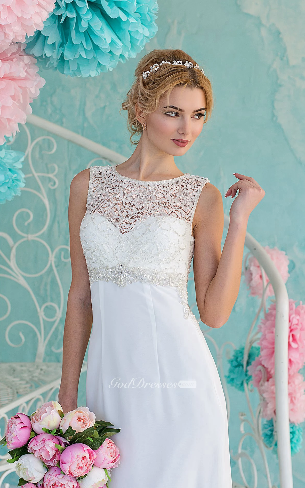 Sheath Maxi Scoop Sleeveless Empire Illusion Chiffon Dress With Lace And Beading