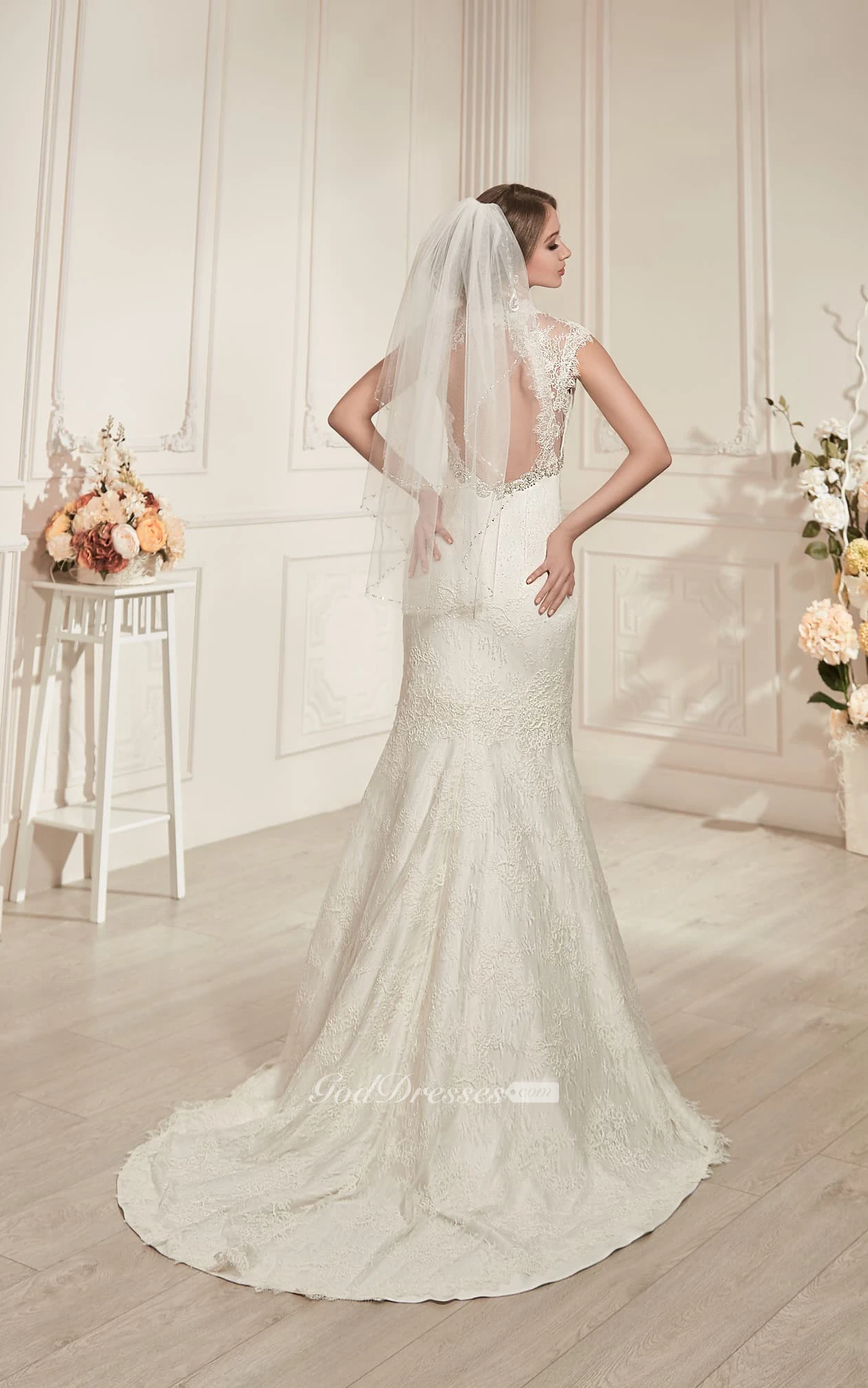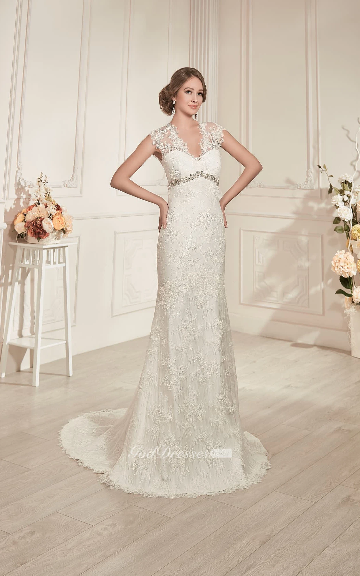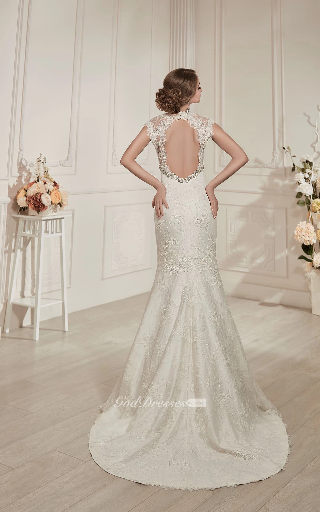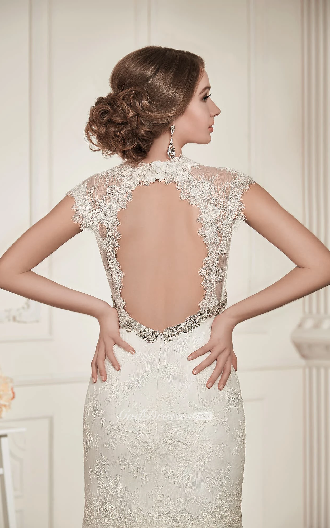 Sheath Maxi V-Neck Cap-Sleeve Keyhole Lace Dress With Beading