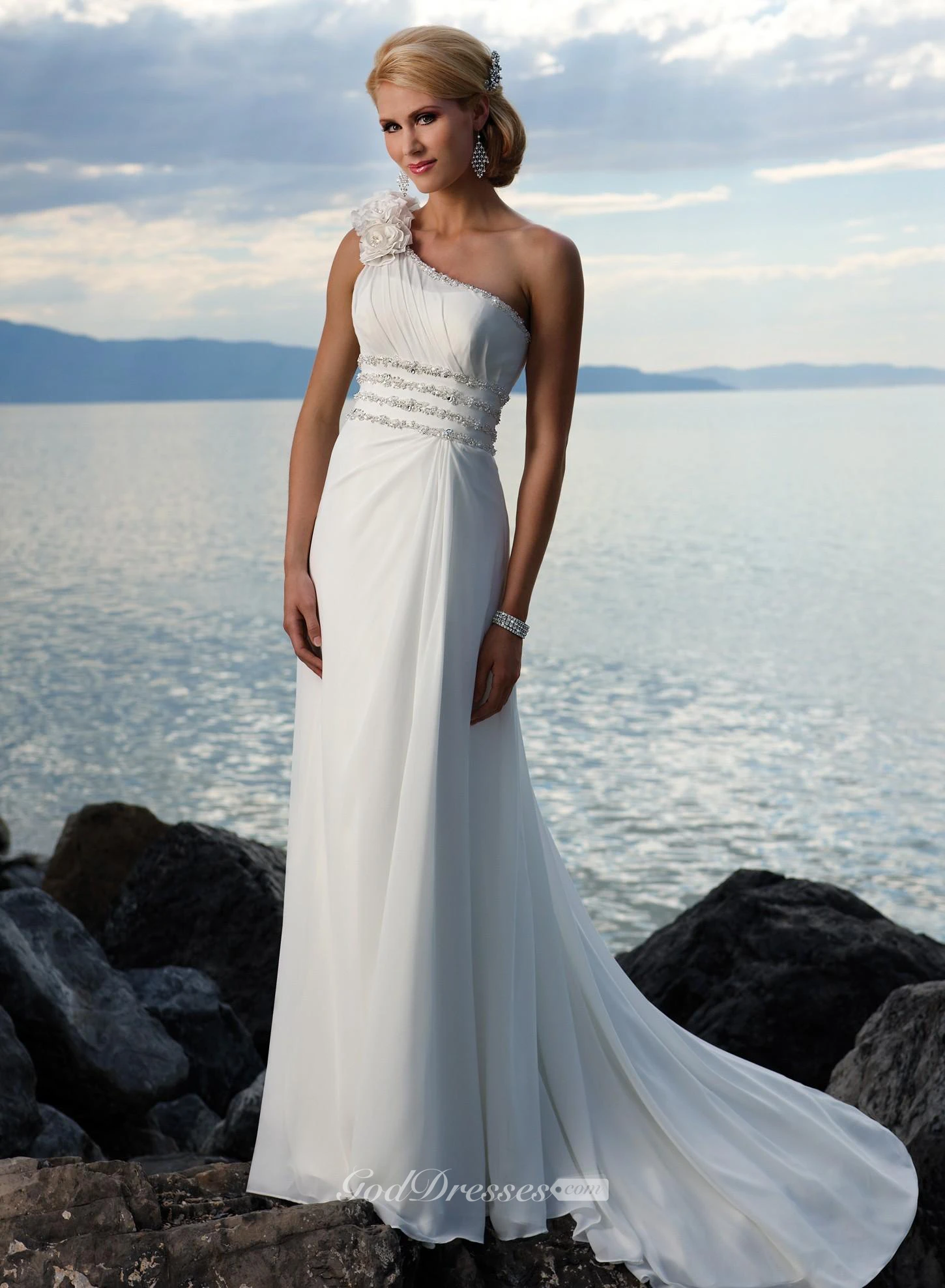 sheath One Shoulder Hand-made Flower Chiffon Sweep Train Wedding Dress