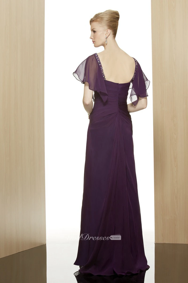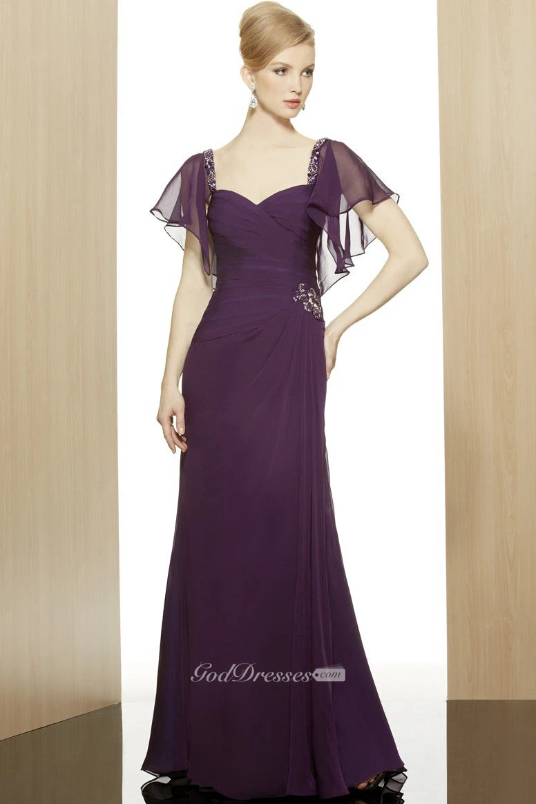 Sheath Poet-Short-Sleeve Beaded Long Sweetheart Chiffon Formal Dress With Zipper Back And Side Draping