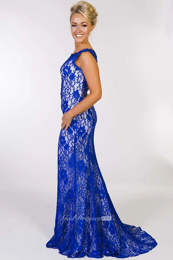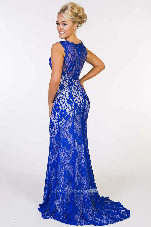 Sheath Scoop Sleeveless Maxi Appliqued Lace Prom Dress With Illusion Back And Pleats