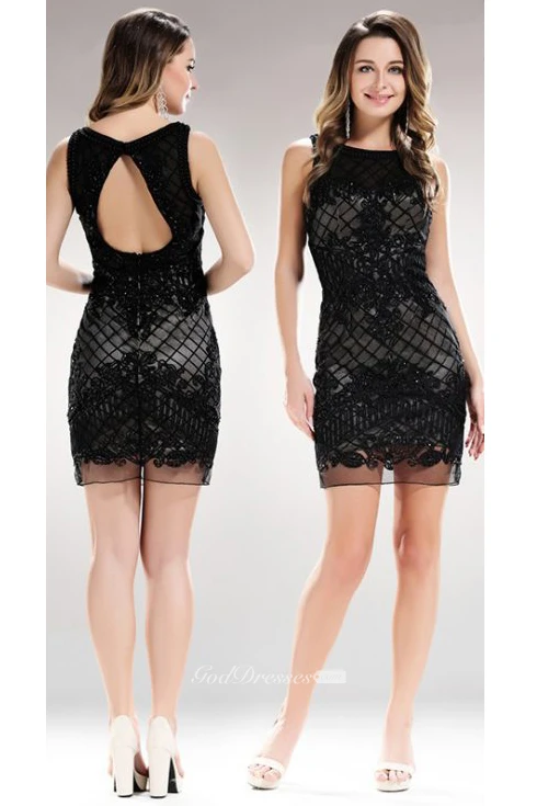 Sheath Short Bateau Sleeveless Keyhole Dress With Appliques