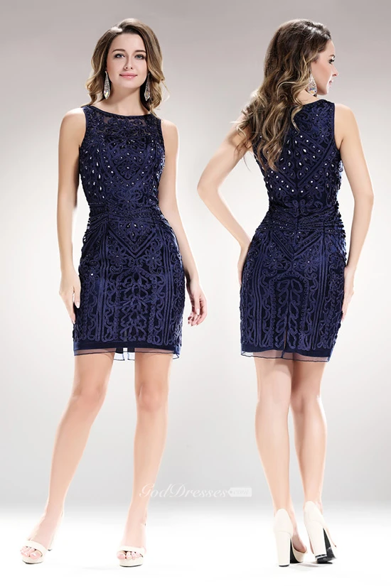 Sheath Short Jewel-Neck Sleeveless Dress With Beading And Lace