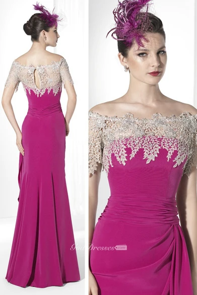 Sheath Short-Sleeve Off-The-Shoulder Side-Draped Maxi Jersey Prom Dress With Appliques