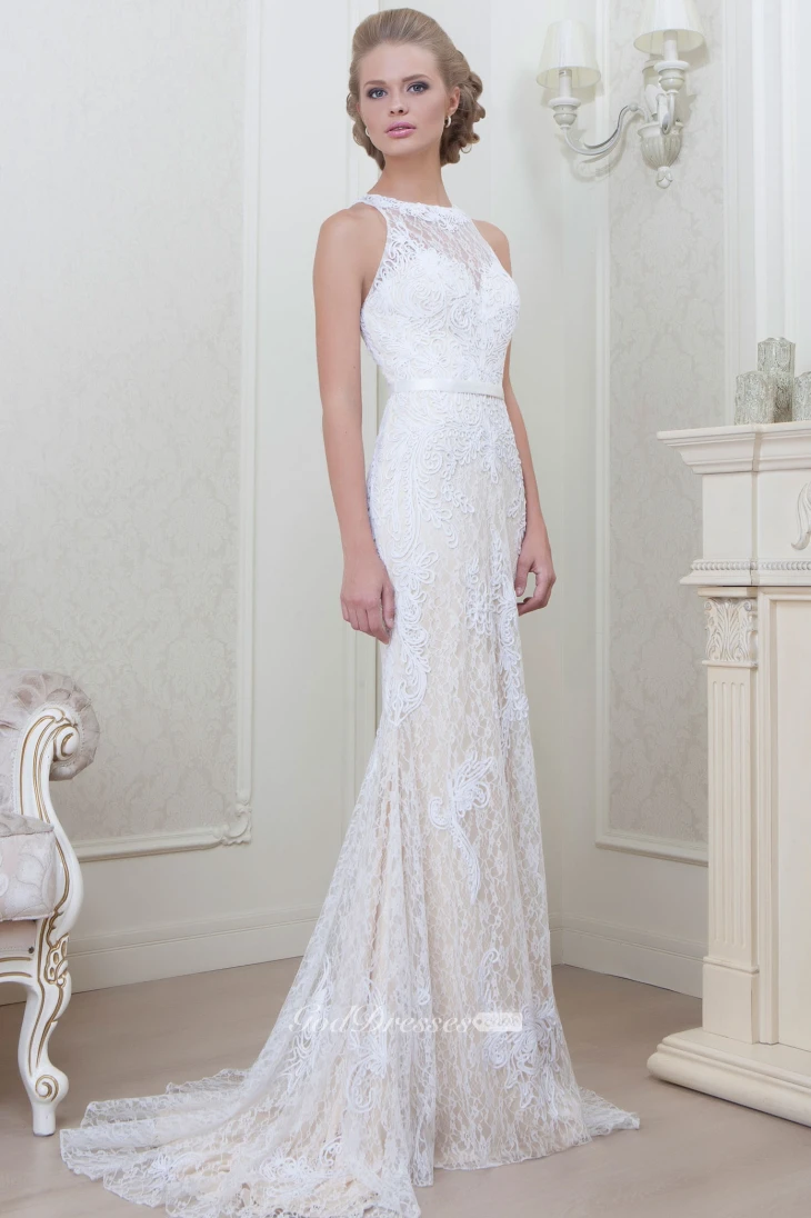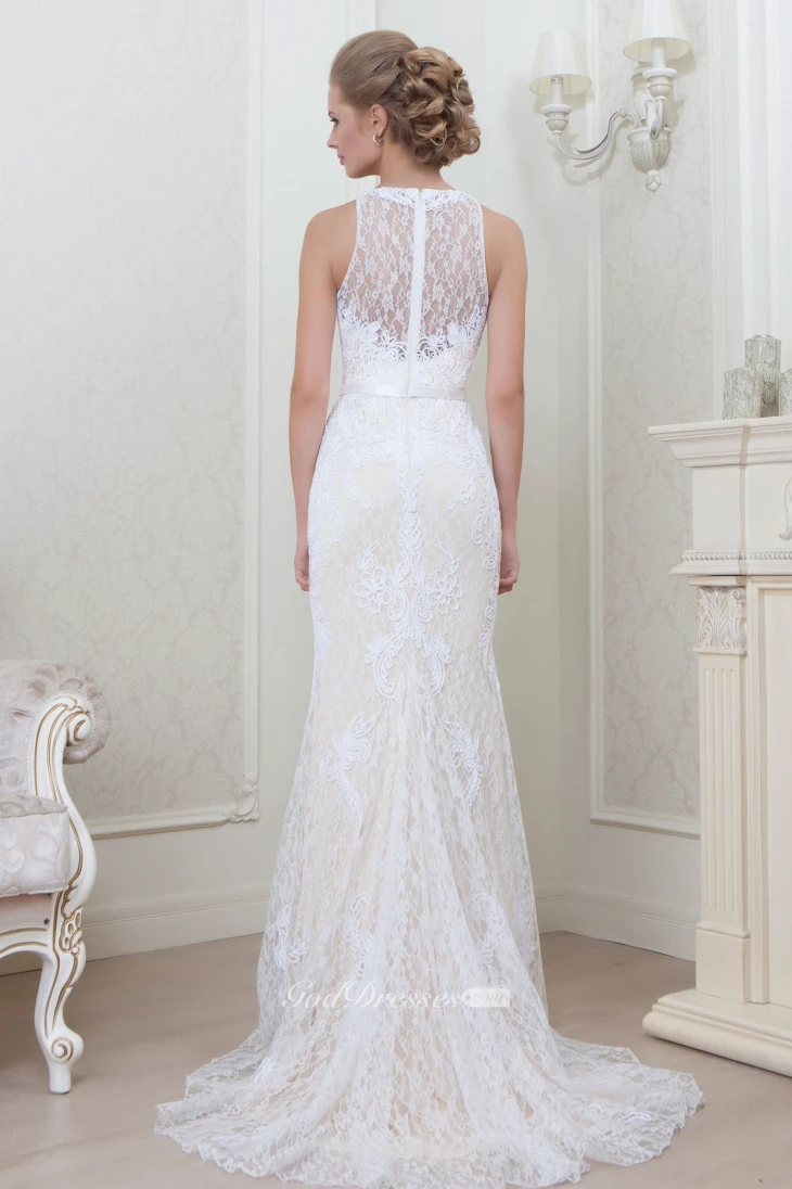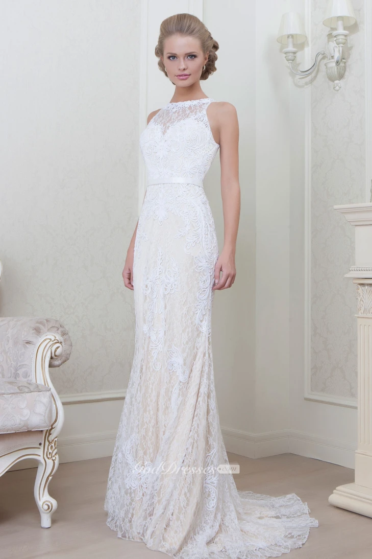 Sheath Sleeveless Appliqued Jewel-Neck Floor-Length Lace Evening Dress With Pleats