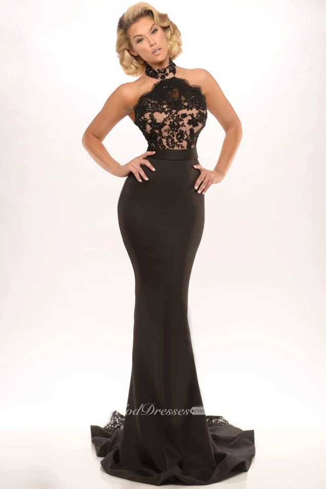 Sheath Sleeveless High Neck Floor-Length Lace Jersey Prom Dress With Backless Style And Sweep Train