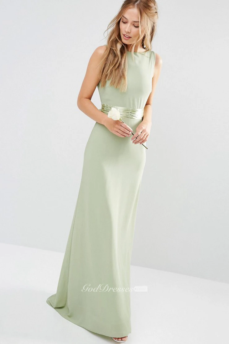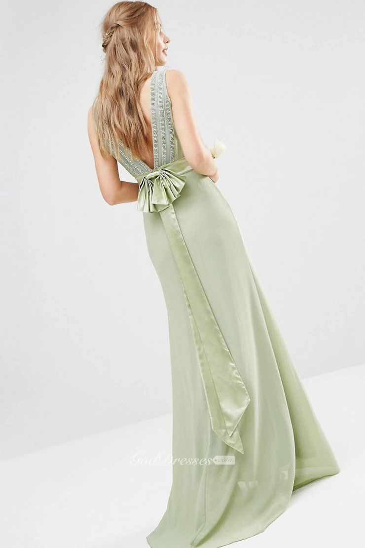 Sheath Sleeveless Long Scoop-Neck Chiffon Bridesmaid Dress With Bow And V Back