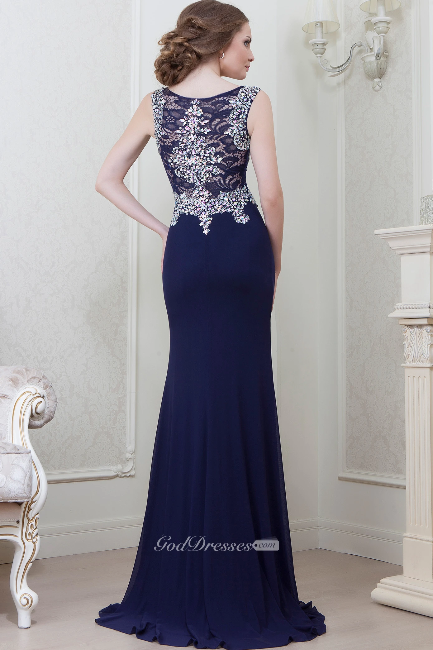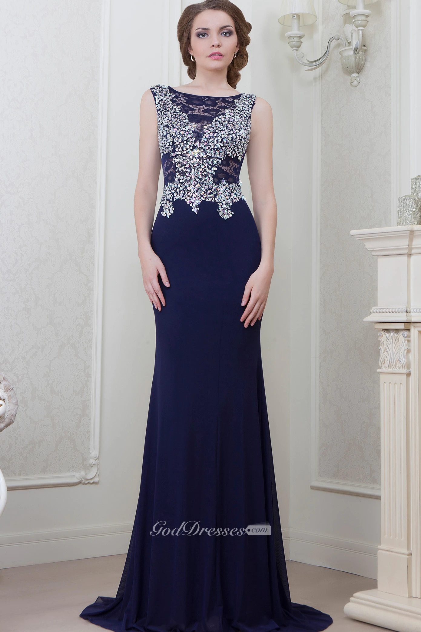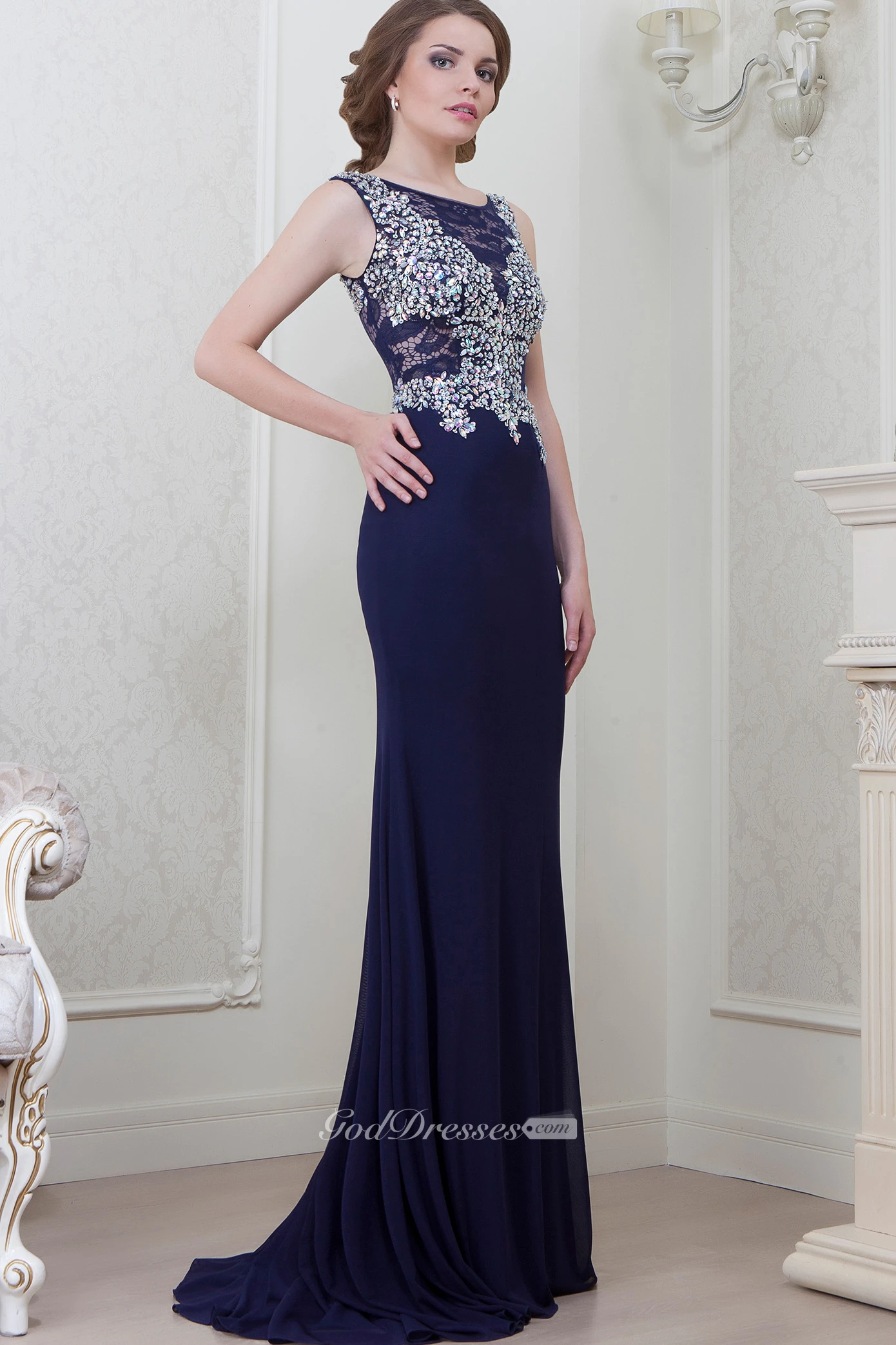 Sheath Sleeveless Scoop-Neck Crystal Floor-Length Jersey Evening Dress With Lace