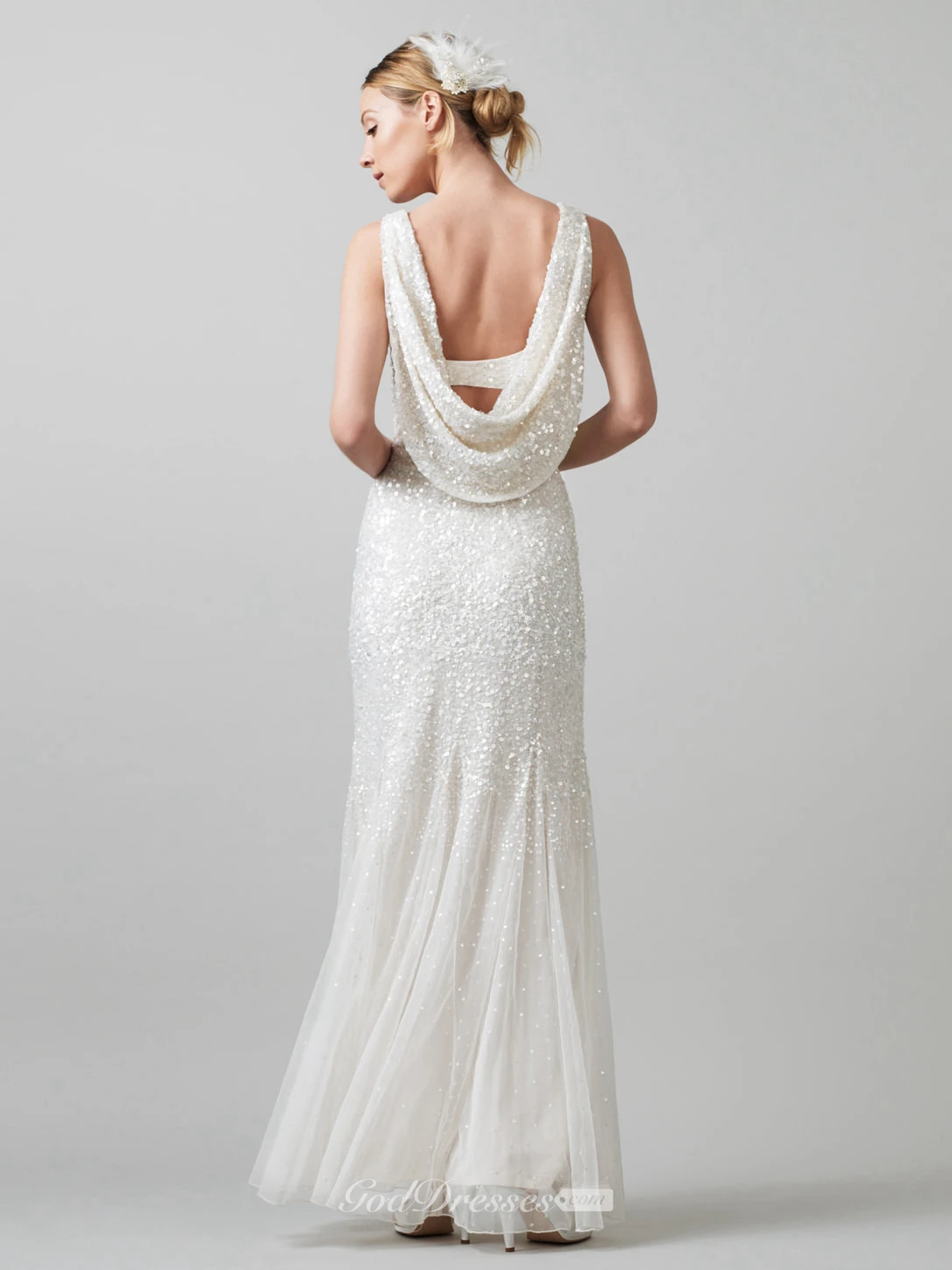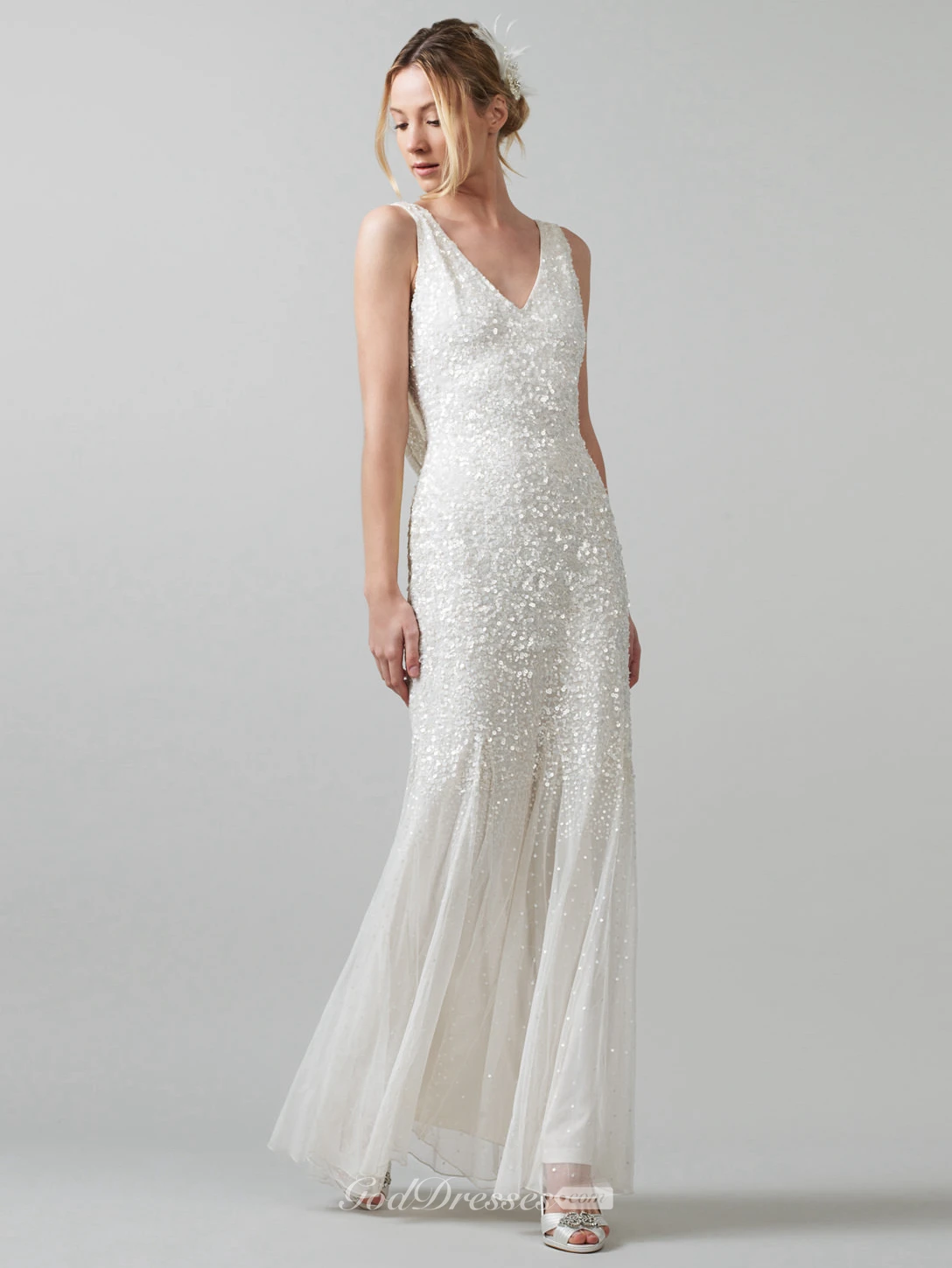 Sheath Sleeveless V-Neck Pleated Floor-Length Sequins Wedding Dress With Low-V Back