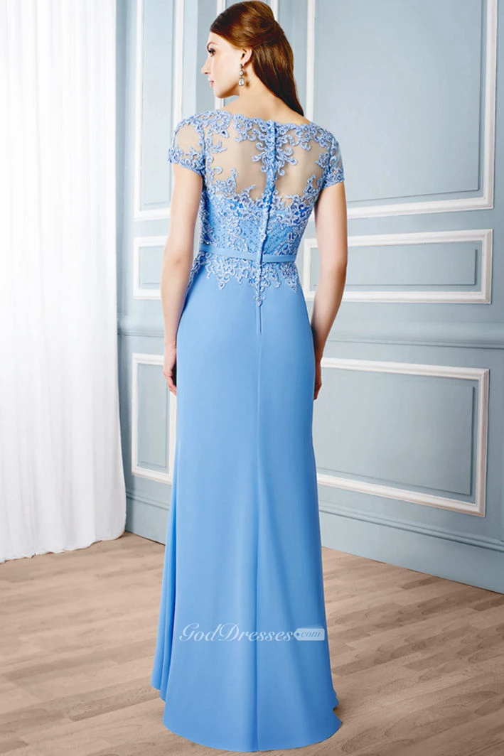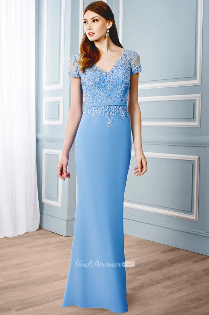 Sheath V-Neck Appliqued Cap Sleeve Chiffon Formal Dress