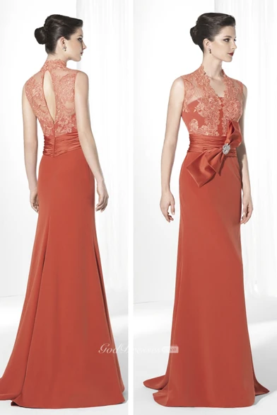 Sheath V-Neck Bowed Floor-Length Sleeveless Jersey&Lace Prom Dress With Appliques